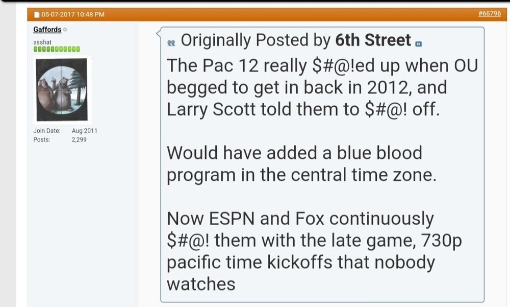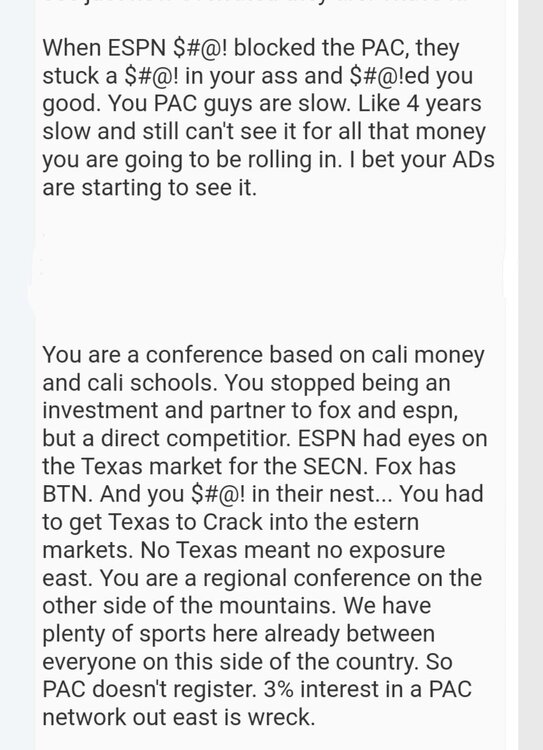 And my response...  Note.  I consider PACs miss on UT/OU/TT/OSU a mistake, but a mistake none the less. But the biggest blunder of all realignment was the PAC telling OU/OSU to piss off. That was the golden ticket to undo their fatal mistake...  Funny thing about it, Stanford was at the center of either stalling, giving ESPN the time to slide in behind them and slit their throat, and for telling OU to fuck off, without considering we would've followed them before long. The Stanford AD fucked up BIG TIME by not understanding the overall picture and killed the PAC. Just like the BIG 12 Commissioner didn't see the big picture of how far the BIG 12 was going to fall behind the BIG/SEC this new revenue contract would be an issue. The Big 12 schools might be okay with being the 3rd highest paid conference even if it is 6-8-10 million a year less, for the most part.  BUT, UT and OU didn't fall in the most part group and were not going to be content with letting the revenue train leave the station without them. Third highest paid conference is not a good thing the big fish