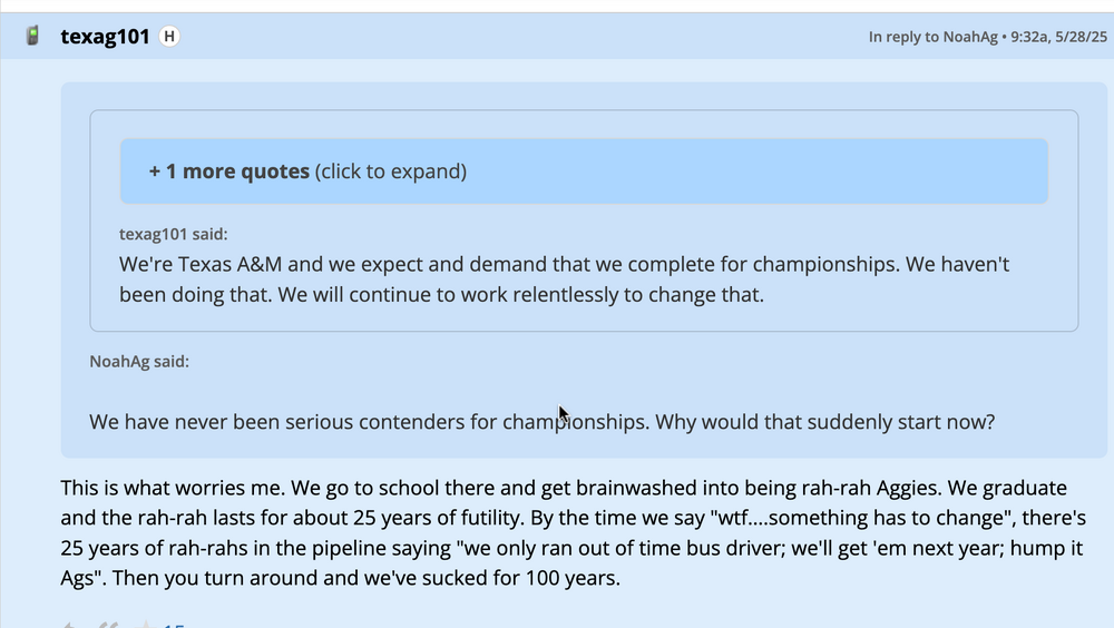 4. Yeah A&M really is unique in the futility department in 86 years 0 NCs in the big 3 sports, 1 runner up last year in baseball This is the league of their own. They are literally the most futile little brother out there Miss St is humiliated if they are compared to A&M.