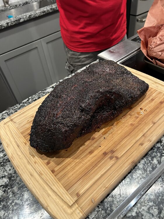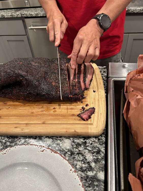 18. I was so busy with the slicing I forgot money shots, but my cousin who I was entertaining did send these my way tonight. I all I've got on that, unfortunately. Packer HEB brisket at $3.49/lb and it was a+ in flavor with roughly a- moistness (wasn't the greatest marbling being a packer and all) --