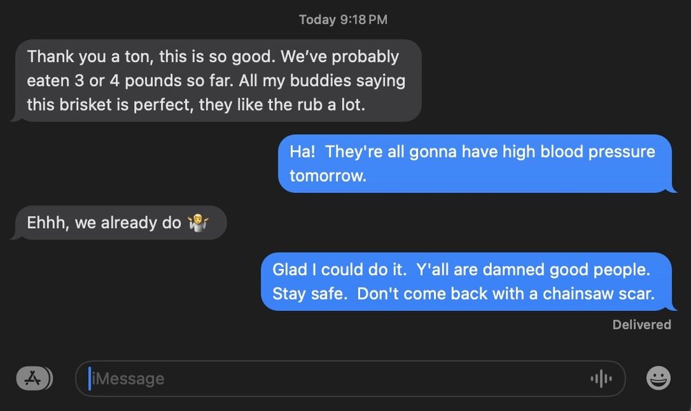 18. Dropped that brisket and smoked corn on the cob off in Boerne for my son-in-law and his DPS recovery team pals. That hotel parking lot looked like the big DPS Death Star HQ on Lamar. Like an elephant grave yard of black and white SUV cruisers. Anyway, I guess the smoker gods were with me today because this text from him just came though on my drive back to Canyon Lake...