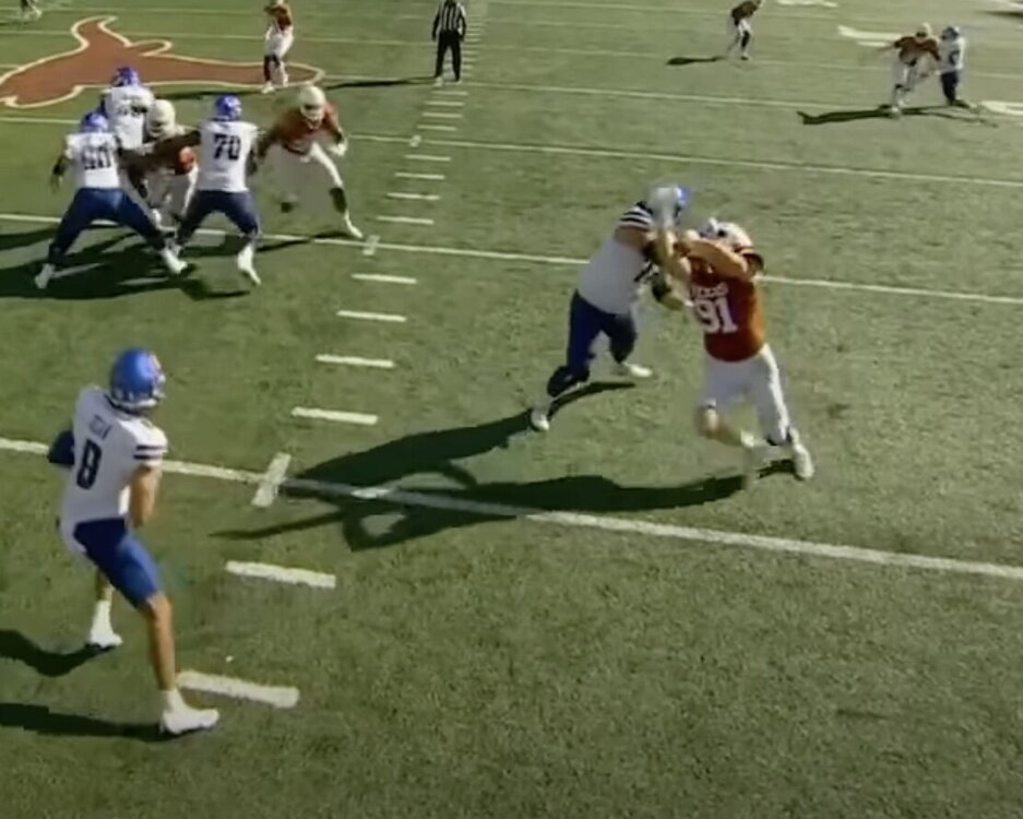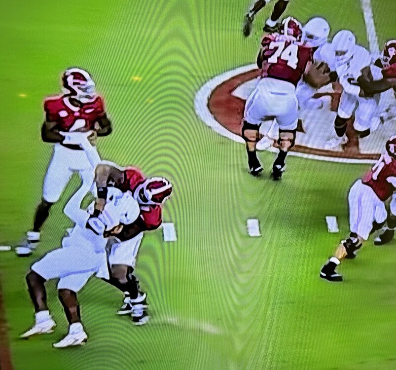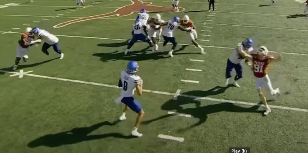 6. No flag for this in the Bama game. I guess the SEC refs got the memo that it's ok to hold at will against Texas. I expect a lot of this coupled with swallowed whistles on Saturday...