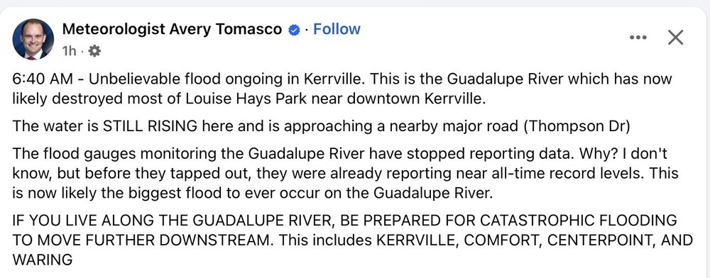 7. Been on the phone with some pals who live in Kerrville and Ingram. They're guys who have been there their whole lives and each one used the same word - "Unbelievable". I tried to check the Kerrville online gauge level and it's not even reporting. This is something not seen before.