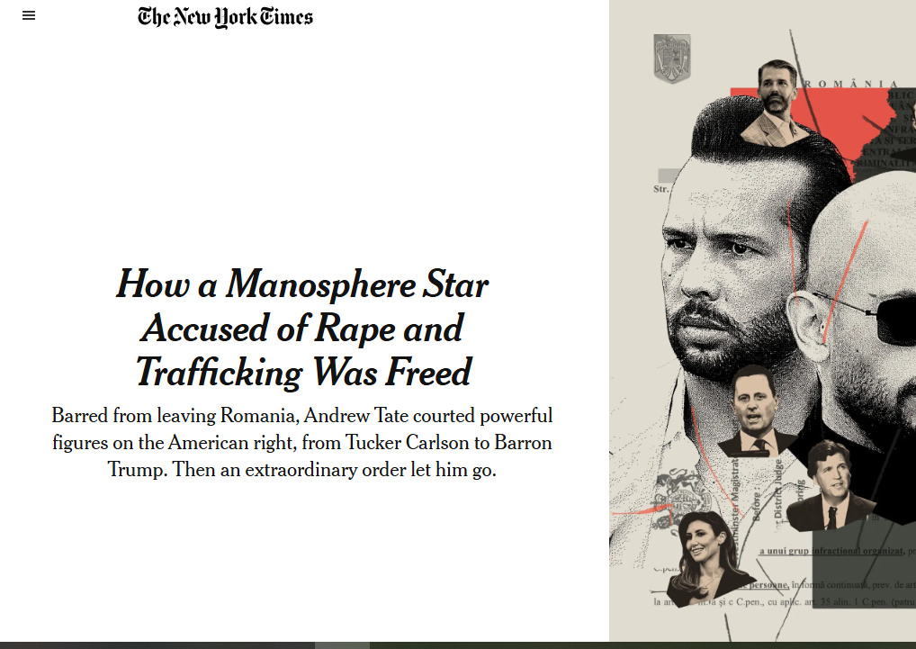 Long read, but it tells a story about Tate allies in and around the regime, who have cultivated a relationship with the two brothers and used their influence to secure their release and allow them to visit the US. Those allies? Donald Trump, Jr. Barron Trump Roger Stone Nick Fuentes Alina Habba Paul Ingrassia Richard Grinnell Candace Owens Tucker Carlson Elon Musk Joseph McBride https://www.nytimes.com/2025/12/10/us/andrew-tate-barron-trump-romania.html https://archive.is/CqLvN