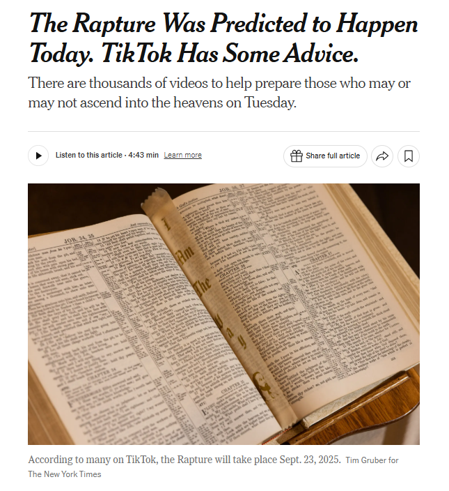 https://www.nytimes.com/2025/09/23/us/rapture-tiktok-sept-23.html The Rapture is upon us, according to TikTokers, some of whom have latched on to a prediction that on Tuesday, Sept. 23 β today β Jesus Christ will return to Earth and take true believers to Heaven. Some evangelical Christians believe the Bible predicts such an event, known as the Rapture, which essentially marks the beginning of the end of human history. They interpret parts of the Christian New Testament as describing the Rapture, including a passage from First Thessalonians that says followers of Christ βwho are alive and remain shall be caught up together with them in the clouds to meet the Lord in the air.β It is not uncommon for various individuals and groups to predict specific dates for the Rapture, sometimes through interpreting passages and events in the Bible, and sometimes claiming they received visions. None of the predictions have obviously come to pass. In recent days, a prediction spread through social media that the Rapture would occur Tuesday, and on TikTok, the hashtag #rapturenow has over 311,000 videos β some of which endorsed the prediction, while many others poked fun at it. For those who believe in the prediction, the TikTokers had some advice: Donβt make any weekend plans, leave your phone unlocked and your passwords accessible for those left behind, and maybe leave your house and car unlocked. With the keys easily accessible if possible. Why today? The date of Sept. 23, 2025, appears to have originated from Joshua Mhlakela of South Africa. Though news reports have widely described him as a pastor, he said in a YouTube video from June: βIβm just a simple person, no title. Iβm not an apostle, Iβm not a pastor, Iβm not a bishop. Iβm just a believer.β In the video, he says that Jesus came to him in a dream in 2018 and told him, βOn the 23rd and the 24th of September, 2025, I will come to take my church.β The context, as Mr. Mhlakela understood it, was the 2026 FIFA World Cup. βHe was telling me that by June 2026, the world is gearing up toward the World Cup,β he said, but because chaos would descend after the Rapture, βthere will be no World Cup in 2026.β His prediction somehow gathered momentum on the internet. Searches for βraptureβ and βthe rapture Tuesdayβ started to climb around Sept. 20, according to Google Trends. While some TikTok creators appeared to believe that the Rapture was imminent and were encouraging their followers to convert to Christianity, more greeted the prediction with satirical advice. One creator said that those who wanted to ensure they would ascend to Heaven should place items that might contain demonic energy, like designer clothing, outside their houses. Another discussed how to style outfits to match the angel wings they would soon receive.