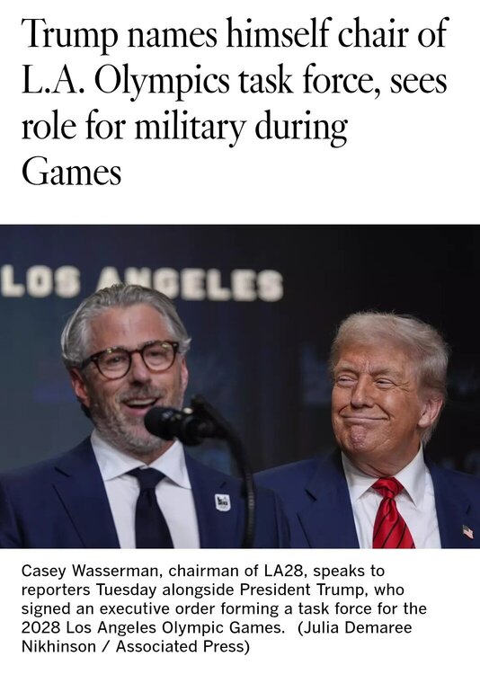 https://www.latimes.com/politics/story/2025-08-05/trump-l-a-2028-olympics-task-force-billion-dollar-security-effort We need to open a betting line on which sellout is going to play the part of Riefenstahl.