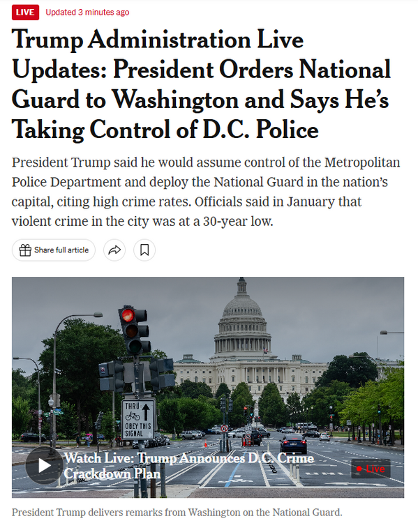 https://www.nytimes.com/live/2025/08/11/us/trump-news The U.S. military is preparing to activate several hundred National Guard troops in Washington, D.C., on Monday, a Defense Department official said. President Trump, who has repeatedly threatened a federal takeover of the nation’s capital, was expected to announce the deployment at a White House news conference on Monday. Mr. Trump has claimed that crime is “totally out of control” in Washington, even though officials announced in January that violent crime in the city was at a 30-year low. On Monday, Mr. Trump is expected to say that up to several hundred District of Columbia National Guard personnel will be sent to support law enforcement officers in the city, the Defense Department official said, speaking on the condition of anonymity to discuss operational matters. No other details were available early Monday. Here’s what else to know: D.C. deployment: Mr. Trump had not approved any official deployment orders for Washington as of early Monday. In a Truth Social post Monday morning, Mr. Trump said: “I will, MAKE OUR CAPITAL GREAT AGAIN!” Unlike a state’s governor, the District of Columbia does not have control over its National Guard, giving the president broad leeway to deploy those troops. The Trump administration also plans to temporarily reassign 120 F.B.I. agents in Washington to nighttime patrol duties as part of Mr. Trump’s crackdown, according to people familiar with the matter. Read more › Viral claim: Mr. Trump’s most recent threats to take control of Washington came after a prominent member of the Department of Government Efficiency reported being beaten in an attempted carjacking. Mr. Trump shared a photograph of the victim, Edward Coristine, a 19-year-old software engineer, on social media last week and wrote, “If D.C. doesn’t get its act together, and quickly, we will have no choice but to take Federal control of the City.” Other deployments: The troop activation in Washington comes after the deployment this summer of nearly 5,000 National Guard troops to Los Angeles with orders to help quell protests that had erupted over immigration raids and to protect the federal agents conducting them. All but about 250 of those National Guard troops have since been withdrawn. And in his first term, Mr. Trump called up National Guard soldiers and federal law enforcement personnel to forcibly clear peaceful protests during the Black Lives Matter protests after the police killing of George Floyd in 2020.
