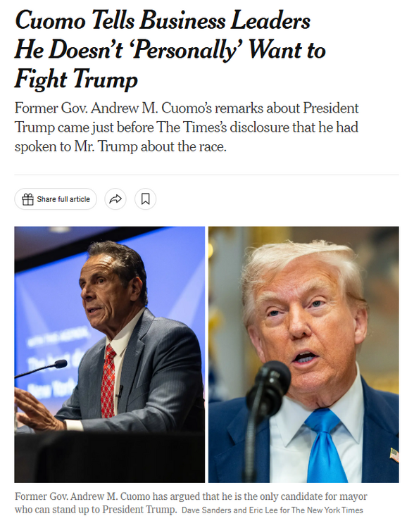 https://www.nytimes.com/2025/08/07/nyregion/cuomo-trump-mamdani-mayor.html Former Gov. Andrew M. Cuomo has positioned himself as the only candidate in the New York City mayor’s race who can forcefully go toe-to-toe with President Trump. But in a closed-door meeting on Wednesday with some of the city’s biggest business leaders, Mr. Cuomo suggested he might adopt a more conciliatory strategy. As he made a case for his candidacy, Mr. Cuomo said he was not “personally” looking for a fight with the president and compared their yearslong relationship to a “dysfunctional marriage.” “I think he wants to be accepted by New York City, and I think there’s an opportunity there,” Mr. Cuomo said, according to four people who shared accounts of the private meeting with 50 corporate executives gathered at Rockefeller Center. He added: “I know, personally, he doesn’t want to fight with me. Personally, I don’t want to fight with him, right? So I don’t think he’s going to be eager to create a conflict with us.” Mr. Cuomo also made the case that Mr. Trump cared about his hometown and wanted to “find a way to be a hero in New York City.” Mr. Trump knew, he said, that confronting Mr. Cuomo would lead to a “nasty, ugly, drawn-out fight.” Just hours after the Wednesday meeting, which was organized by the Partnership for New York City, The New York Times reported that Mr. Cuomo had in recent weeks spoken privately to the president about the race. Like many of the city’s business leaders, the president has expressed alarm about Zohran Mamdani, the Democratic nominee who has proposed raising taxes on the wealthy and freezing rents for some tenants. The remarks to the Partnership speak to the sometimes divergent stances Mr. Cuomo is adopting around Mr. Trump publicly and privately as he seeks to revive his campaign after losing the Democratic primary to Mr. Mamdani, a 33-year-old state assemblyman and democratic socialist. Mr. Cuomo has previously said the White House is working to “undermine our democracy” and has criticized Mr. Trump’s immigration policies. Mr. Cuomo needs to court business leaders, voters and potential donors who are friendlier with Mr. Trump or fear his influence. But inching too close to him could alienate Democrats in a city where the president is overwhelmingly unpopular. Mr. Mamdani and his allies quickly seized on The Times’s report. At a news conference on Thursday morning, Mr. Mamdani called the conversation between the two men “a betrayal” of the city by Mr. Cuomo. He held the event outside 26 Federal Plaza in Lower Manhattan, the hub for Immigration and Customs Enforcement in the city. “The job of mayor is not to audition to be the jester for a want-to-be king,” Mr. Mamdani said. “It is to be the person who stands up for the values of this city, the fabric of this city and the people of this city." Mr. Mamdani said he had not spoken to Mr. Trump and played down concerns that his election could put a bigger target on New York City’s back, given the president’s virulent criticism of him. He said he would fight Mr. Trump at all costs if he sought to harm New Yorkers, but was open to collaboration to help the city. “If the president and the administration is looking to work for the benefit of New Yorkers, which is what he spent so much of his campaign speaking about, that is a different conversation,” Mr. Mamdani said. Mr. Cuomo was scheduled to hold an event Thursday afternoon. His meeting with business leaders was intended to make a case for why he, rather than Mayor Eric Adams or the Republican candidate, Curtis Sliwa, was the best positioned to defeat Mr. Mamdani and guide the city through a tumultuous era. The former governor is leading Mr. Adams in the polls, but has said candidly that Mr. Mamdani, the race’s front-runner, will prevail if opposition to him remains splintered. Among the attendees were the head of Pfizer and Tishman Speyer, the real estate giant. In a statement on Wednesday, Rich Azzopardi, a spokesman for Mr. Cuomo, did not deny that the former governor and the president had spoken, but sought to put distance between them. He said the two men had not spoken “in some time” and that “as far as I know,” they had not discussed the race. Mr. Azzopardi suggested Mr. Trump would be more likely to prefer that Mr. Mamdani or Mr. Adams win. “He believes Mamdani would serve as a political boon to Republicans nationwide in the midterms, symbolizing what he sees as the Democratic Party’s extremism,” he said. He called Mr. Adams, who worked with the Trump administration to get federal corruption charges dismissed against him, as a “wholly owned subsidiary of the president.” Mr. Cuomo said in a recent interview on WNYC that the best way to handle Mr. Trump was with a confrontational approach. “I don’t know there is a strategy besides being very aggressive because he’s a very aggressive personality,” Mr. Cuomo said. “He comes in very strong. His tactic is just to overpower you, and you have to meet force with force.”