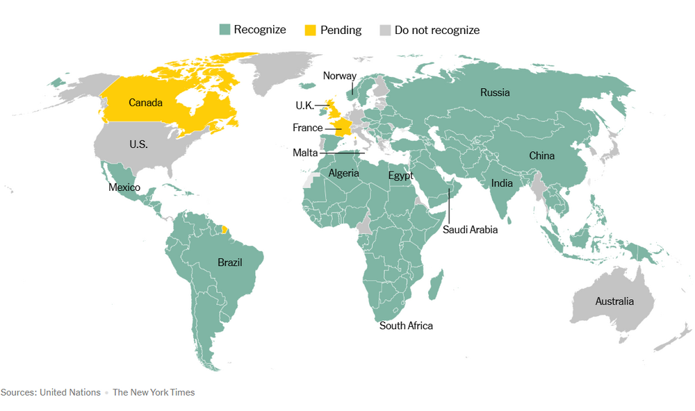 Canada to Recognize Palestinian State at the U.N. General Assembly Canada joins France and Britain in taking similar steps, after months of increasing criticism of Israel by Prime Minister Mark Carney. Canada said on Wednesday that it would recognize Palestine as a state, if the Palestinian Authority commits to making certain changes including holding elections. Prime Minister Mark Carney said he had received assurances that such changes would be carried out in a call with the Palestinian leader, Mahmoud Abbas, and plans to formally recognize Palestine during the United Nations General Assembly in September. “The deepening suffering of civilians leaves no room for delaying coordinated international action to support peace, security and the dignity of human life,” Mr. Carney said following a cabinet meeting largely focused on Gaza. In recent days, Mr. Carney and others in his government — as well as leaders in France and Britain — have condemned the growing humanitarian crisis and rising starvation in Gaza, which Mr. Carney blamed on Israel’s refusal to cede control of aid to international organizations. Gaza health officials say dozens of people, including children, have died of starvation in recent weeks. The dramatic policy reversal by Canada follows similar ones by France and Britain, increasing the pressure on Israel to end the nearly two-year-old war in the Gaza Strip. Israel swiftly condemned the announcement.