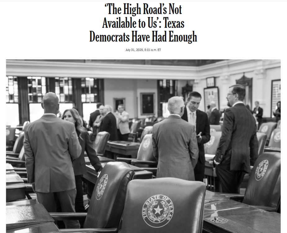 A lot of big talk in this OpEd appearing in today's NYTimes about Texas Dems being fed up with this redistricting push and ready to fight. We'll see. Gift link: https://www.nytimes.com/2025/07/31/opinion/texas-redistricting-democrats.html?unlocked_article_code=1.ak8.u5o2.cYpSX-B798Xd&smid=url-share