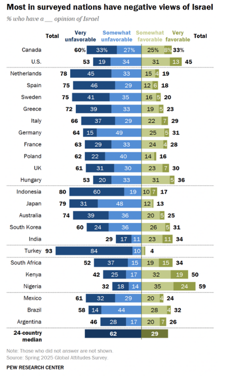 Blowback of world opinion: This is from early June, so it likely doesn't include the full impact of the ongoing forced starvation of Palestinian civilians. Only two of the 24 nations surveyed still have a positive opinion of Israel. https://www.pewresearch.org/short-reads/2025/06/03/most-people-across-24-surveyed-countries-have-negative-views-of-israel-and-netanyahu/