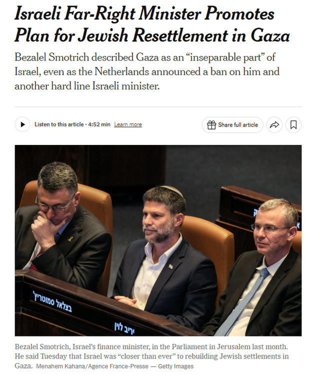 Reminder: In 2005, he was arrested in Israel while in possession of almost 200 gallons of gasoline on suspicion of participating in an attempt to blow up a highway. In a 2015 interview, he said, "The Palestinian Authority is a burden, and Hamas is an asset", explaining that, while the it was harming Israel in international forums, Hamas' status as a terrorist organization meant that "no one will recognize it, no one will give it status at the ICC, no one will let it put forth a resolution at the U.N. Security Council". Also in 2015, he said, "Anyone who wants to protect the Jewish People and opposes mixed marriages is not a racist. Whoever wants to let Jews live a Jewish life without non-Jews is not a racist." In 2019, he campaigned on restoring the Torah justice system (Shariah Law, anyone?). In 2021 he said to Arab lawmakers that, "You're here by mistake, it's a mistake that Ben-Gurion didn't finish the job and didn't throw you out in 1948." In 20023 (before the Hamas attack), he called for "striking the cities of terror and its instigators without mercy, with tanks and helicopters". He also said that Israel should act "in a way that conveys that the master of the house has gone crazy". Last year, he said, "There are no half measures ... Rafah, Deir al-Balah, Nuseirat – total annihiliation. 'Thou shalt blot out the remembrance of Amalek from under heaven.' There is no place for them under heaven." This year, he said, "They will be totally despairing, understanding that there is no hope and nothing to look for in Gaza, and will be looking for relocation to begin a new life in other places." https://www.nytimes.com/2025/07/29/world/middleeast/israel-gaza-jewish-resettlement.html Bezalel Smotrich, the far-right finance minister of Israel, said Tuesday that the country was “closer than ever” to rebuilding Jewish settlements in Gaza that were evacuated 20 years ago, adding that the war there had created the opportunity to expand them even further. Mr. Smotrich’s remarks came soon after the Netherlands announced it was barring him and another far-right government minister, Itamar Ben-Gvir, from entering the country in an effort to pressure Israel into stopping the 21-month war that has devastated Gaza. The Palestinian enclave is now in the grips of a dire hunger crisis that has brought international outrage. Both Mr. Smotrich and Mr. Ben-Gvir have called for the war to continue. They want “voluntary” migration of Gaza’s population of two million Palestinians, a measure that international legal experts have said would amount to ethnic cleansing. The pair have already been sanctioned by other countries, including Australia, Canada, New Zealand, Norway and Britain, for inciting violence against Palestinians in the West Bank. They have also been barred from entering Slovenia. Speaking at a conference for the anniversary of Israel’s unilateral withdrawal from Gaza in the summer of 2005, Mr. Smotrich described the territory as “an inseparable part of the land of Israel.” “It’s real,” he said of the idea of Israeli settlers’ returning to Gaza. “For 20 years we called it wishful thinking. It seems to me it is now a real working plan.” Mr. Smotrich, who also is the minister for settlement affairs in the Ministry of Defense, made his remarks as the humanitarian crisis reached new depths in Gaza. About 60,000 Palestinians, including thousands of children, have been killed in the war, according to Gaza health officials, whose data does not distinguish between combatants and civilians. Much of the coastal enclave of Gaza has been reduced to rubble, and most of the population has been displaced. A United Nations-backed food-security group said Tuesday that famine was unfolding across most of the territory, citing months of severe aid restrictions imposed by Israel. The war was set off by the Hamas-led attack on Israel on Oct. 7, 2023, in which about 1,200 people were killed and about 250 more people were abducted to Gaza. Negotiations for a 60-day cease-fire that would bring the release of some of the 50 remaining hostages, about half of whom are believed to still be alive, have stalled. Asked by an interviewer at the conference if the Israeli government was discussing an actual plan to reestablish settlements in Gaza, Mr. Smotrich did not give a direct answer but said, “Where there is no settlement there is no army; where there is no army there is no security.” “I don’t want to return to Gush Katif,” he said, referring to the group of Jewish settlements in southern Gaza that were abandoned in 2005 as part of the Israeli government’s so-called disengagement plan from Gaza. “It’s too small and crowded,” he said of the original area of the group. “It has to be much larger,” he said, adding that the situation in Gaza today “allows for bigger thinking.” Mr. Smotrich has opposed Israel’s efforts, made under international pressure, to facilitate the entry of more aid into Gaza in recent days, and he has threatened in the past to leave the government under such circumstances. But he told the audience Tuesday that he was staying in office because he has “a reasonable basis to assume that good things are going to happen.” In a separate statement responding to the travel ban, Mr. Smotrich said what was more important to him than being able to enter the Netherlands or other European countries was “that my children, grandchildren and great-grandchildren, and all Jews around the world, be able to live in the state of Israel safely for decades and centuries to come.” In the withdrawal of 2005, Israel pulled its troops and about 8,000 settlers out of Gaza, which it had captured from Egypt in the 1967 war, and demolished the 21 settlements it had built there. Right-wing supporters of the settlement movement decried what they called an “expulsion” and vowed to return and rebuild. The office of Prime Minister Benjamin Netanyahu did not immediately resp