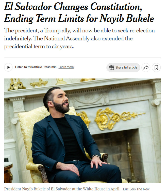 Was that a one-time, lump-sum payment, or is that the annual bill? Either way, that's quite the "deal" Trump made with the technofascist running that country, but I'm sure Bukele's ties to international gangs, including MS-13, have to play a role in the whole thing. It's funny how their partnership materialized overnight as soon as Trump was elected. Anyway, El Salvador just changed their Constitution by eliminating term limits, which undoubtedly Trump finds both inspirational and aspirational. Oh, and Bukele's got a really punchable face. https://www.nytimes.com/2025/08/01/world/americas/el-salvador-bukele-term-limits.html El Salvador’s National Assembly on Thursday approved sweeping changes to the nation’s Constitution, paving the way for President Nayib Bukele, who is in his second term in office, to run for re-election indefinitely. The legislature, in which Mr. Bukele’s party holds a supermajority, voted to end presidential term limits and extend a president’s term in office from five years to six, according to the National Assembly's X account. Mr. Bukele was first elected in 2019 and successfully ran in 2024 for a second term, even though legal scholars said at the time that El Salvador’s Constitution barred a president from serving consecutive terms. After Mr. Bukele’s legislative allies installed new judges on the Supreme Court, the court reinterpreted the Constitution and cleared the way for the president to run again. The 44-year-old president has consolidated power while in office, leading his Nuevas Ideas party to its supermajority in the legislature and cracking down on gangs through mass arrests. Killings and extortion by gangs have gone down dramatically under Mr. Bukele, but civil liberties have also deteriorated, Salvadoran human rights defenders say. In June, Mr. Bukele said he would rather be called a dictator than let criminals operate with impunity. He has also positioned himself as President Trump’s closest ally in Latin America, playing a role in Mr. Trump’s deportation plans by imprisoning immigrants expelled from the United States, in exchange for the return to El Salvador of members of the MS-13 gang who had been in U.S. custody. The amendments to five articles of the Constitution quickly passed on Thursday, with 57 votes in favor and three opposed, the National Assembly said on X. The changes will ensure that presidential elections coincide with legislative and municipal elections, Ana Figueroa, the Nuevas Ideas lawmaker who proposed the amendments, wrote on social media after the vote. She also noted that legislators and local officials, like mayors, do not have term limits. Mr. Bukele’s current term ends in 2029, but Ms. Figueroa said that it should end in 2027 to coincide with legislative elections, at which point he could run for a six-year term.