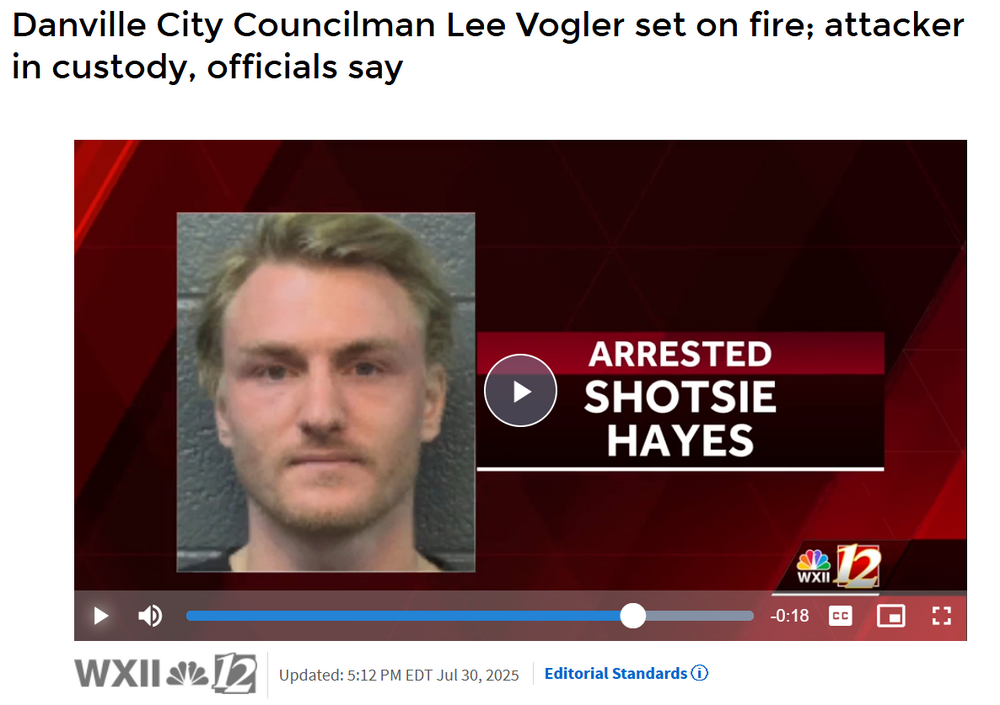 Mystery solved. The report states that it was a personal beef between the two and not politically related. https://www.wxii12.com/article/virginia-councilman-set-on-fire-lee-vogler-danville/65553800
