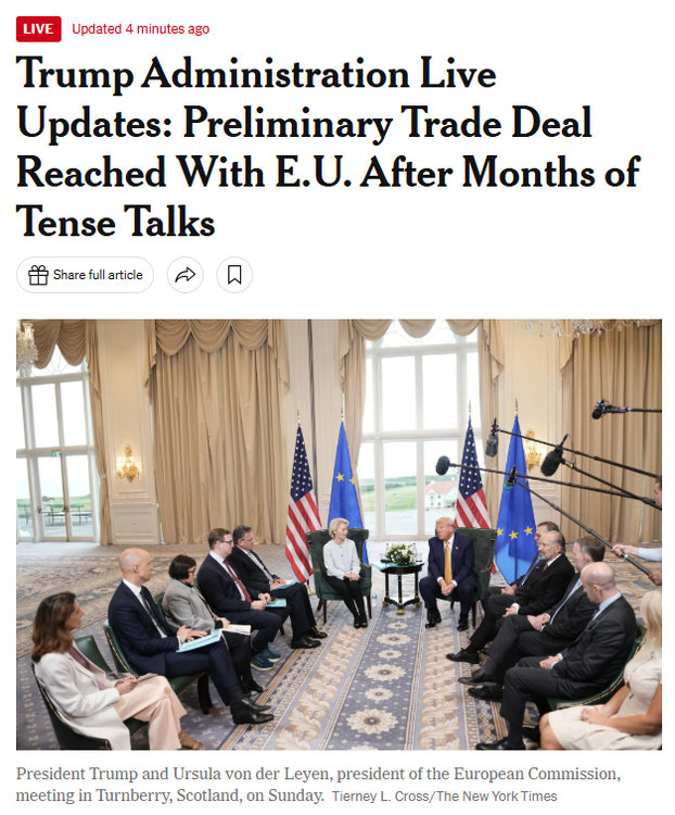 A tariff of 15% has been agreed upon for all imports from the EU. Last year, the US imported $610 billion of goods from Europe. Assuming we continue to import that amount and this deal sticks, American consumers will pay an additional $91.5 billion in new taxes on those goods. https://www.nytimes.com/2025/07/27/world/europe/eu-trade-deal-trump-tariffs.html?smid=url-share