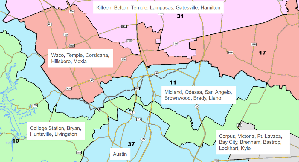 That whole area from northern Travis County up to Georgetown is fucked on the proposed map. Say you get in your car from North Austin and head up to Ikea. You start out in TX-37, drive a couple of miles through TX-10, then a couple more in TX-11, maybe pass one Exit in TX-17, and you finally reach your destination, only a few miles away in TX-31. Communities of interest, eh? Western Travis/Round Rock is paired up with Livingston in the Piney Woods of East Texas. Round Rock/Pflugerville hangs with Midland/Odessa. Cedar Park/Round Rock goes along with Corsicana. Yeah, buddy.