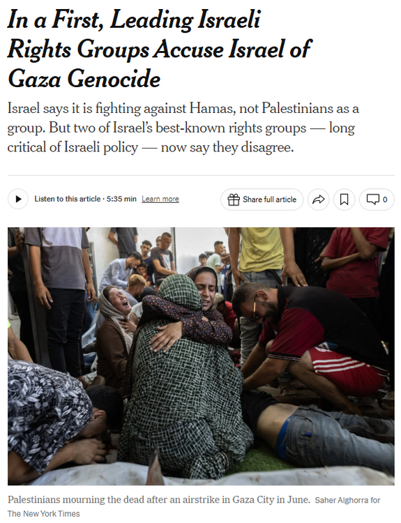 https://www.nytimes.com/2025/07/28/world/middleeast/israel-genocide-gaza-rights-groups.html Two of Israel’s best-known human rights groups said Monday that Israel was committing genocide against Palestinians in Gaza, adding fuel to a passionately fought international debate over whether the death and destruction there have crossed a moral red line. The two groups were B’Tselem, a rights monitor that documents the effects of Israeli policies on Palestinians, and Physicians for Human Rights — Israel. Their announcement was the first time major Israeli rights groups have publicly concluded that the Gaza war is a genocide, an assessment previously reached by some organizations like Amnesty International. In a report titled “Our Genocide,” B’Tselem cited the devastating effects of Israel’s war on ordinary Palestinians to support their claim: the killing of tens of thousands of Palestinians in Gaza; the razing of huge areas of Palestinian cities; the forced displacement of nearly all of Gaza’s two million people; the restriction of food and other vital supplies. All together, the Israeli campaign has amounted to “coordinated action to intentionally destroy Palestinian society in the Gaza Strip,” the organization wrote. “In other words: Israel is committing genocide against Palestinians in the Gaza Strip.” The debate over whether the war in Gaza constitutes genocide has also played out at the International Court of Justice, where South Africa has brought a genocide case against Israel. The court has yet to rule on the matter. The office of Prime Minister Benjamin Netanyahu did not immediately comment. Speaking at the International Court of Justice in January 2024, Tal Becker, a member of Israel’s legal defense, said that Israel was fighting Hamas, not targeting Palestinians wholesale. “What Israel seeks by operating in Gaza is not to destroy a people, but to protect a people, its people, who are under attack on multiple fronts, and to do so in accordance with the law,” Mr. Becker told the court. Genocide has a specific definition in international law: particular acts carried out with intent to destroy a group in whole or in part. The accusation hits a painful nerve for Israel, a state founded after Nazi Germany’s attempt to exterminate European Jewry. Israel vigorously denies that its war against Hamas in Gaza amounts to genocide, countering that Hamas seeks to destroy the Jewish state. Israeli officials have also pointed to the Hamas-led attack on Oct. 7, 2023, in which 1,200 people were killed, mostly civilians, which prompted the devastating Israeli response. The subsequent Israeli bombing campaign and ground offensive in Gaza have killed more than 59,000 people, including thousands of children, according to the Gazan health ministry. That toll does not distinguish between civilians and combatants; at one point, the Israeli military chief said nearly 20,000 Hamas fighters had been killed in the conflict, without providing evidence. Yuli Novak, the director of B’Tselem, said that she was not seeking to minimize the “horrific attack” that Hamas had perpetrated on Oct. 7. But the assault had prompted an Israeli assault on Palestinian life in Gaza that had spiraled into genocide, she said. “The report we are publishing today is one we never imagined we would have to write,” Ms. Novak said at a news conference in Jerusalem. “But in recent months, we have been witnessing a reality that has left us no choice but to acknowledge the truth.” As part of the case for genocide, international law requires that there be proof of intent. In the report on Monday, B’Tselem cited a string of dehumanizing remarks by Israeli government officials, such as a statement by Yoav Gallant, a former defense minister, that Israel was fighting “human animals” in Gaza. Some Israeli politicians have also said that their goal is to drive the remaining Palestinians out of Gaza. Israeli leaders argue that the country has adhered to humanitarian law, that generals work closely with legal advisers who ensure compliance with standards, and that Israel has gone above and beyond what other Western countries have done in similar situations. Mr. Netanyahu has at times distanced himself from the most extreme statements made by his political allies. But for the vast majority of Gazan civilians, the past 22 months have been a desperate attempt to survive constant Israeli bombardment, find enough food and clean water for their families, and flee amid Israeli warnings to immediately evacuate or risk being killed. The growing number of Gazans now starving has contributed to rising criticism of Israel by some of its longtime allies. Israeli military officials often attributed the deadly impact of the war on Palestinians to Hamas’s strategy of fighting its insurgency by hiding among civilians. The Israeli rights groups said that alone could not explain the rampant death and destruction in Gaza. “Israel’s claim that Hamas fighters or members of other armed Palestinian groups were present in medical or civilian facilities, frequently without providing any evidence, cannot justify or explain such widespread, systematic destruction,” B’Tselem wrote.