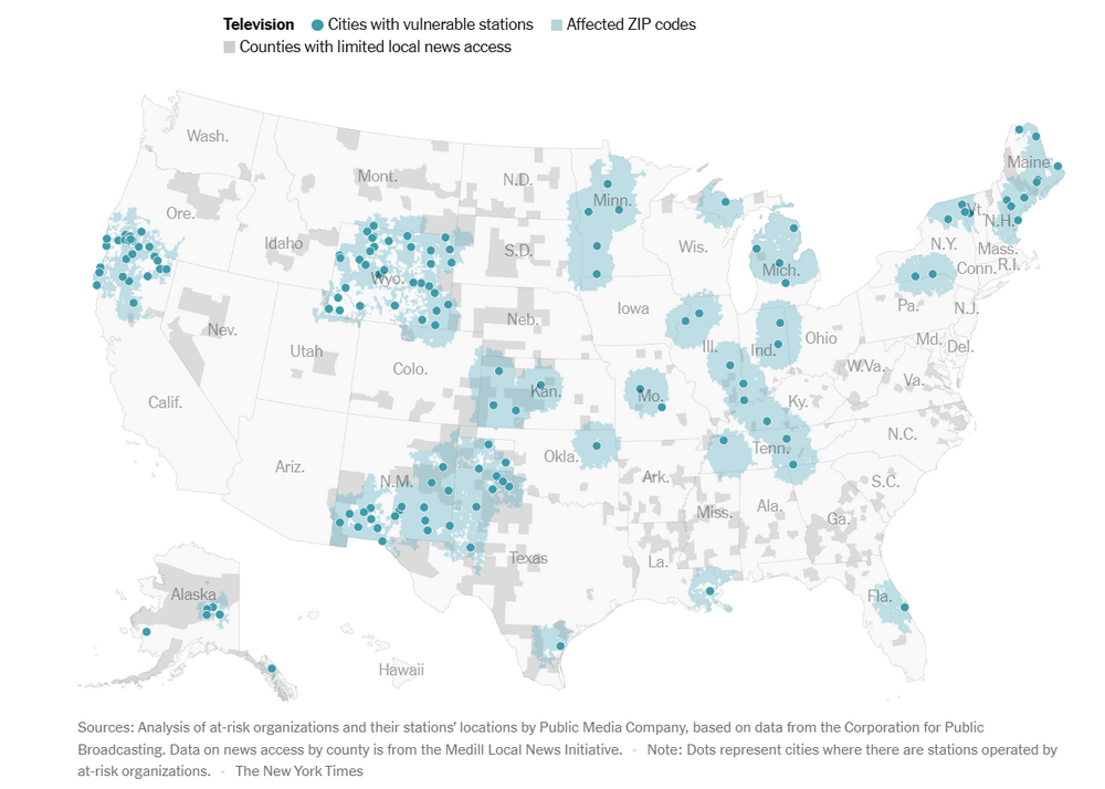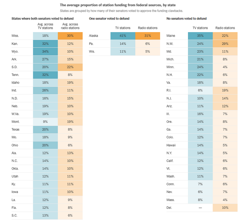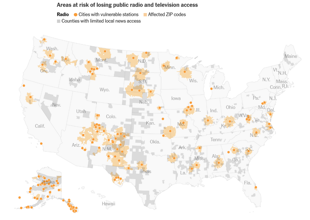 I'm afraid I might lose over-the-air access to NPR. I already can't get PBS. The signal's too weak here, and I don't do cable. I'm not in one of the affected orange ZIP codes, but Texas Public Radio, based in San Antonio, has a transmitter that serves my community. This morning, they're already asking for increased donations for a "resiliency fund" in response to the cuts, and I doubt many out here contribute or even know TPR exists. So, if they end up having to cut service, I'm sure we'll probably be on the chopping block (I do still listen to KUT quite a bit with the phone app). Regardless of my local access, cutting funding sounds like it could cause a cascading effect throughout the NPR network. Where Congressβs Cuts Threaten Access to PBS and NPR President Trumpβs proposal to eliminate federal funding for public broadcasters threatens scores of radio and TV stations across the United States that air PBS and NPR programs. Early Friday, the House gave final approval to a measure that would eliminate $1.1 billion in funding for the Corporation for Public Broadcasting, the company that funds NPR, PBS and stations in major cities and far-flung towns like Unalakleet, Alaska, and Pendleton, Ore. The measure will now be sent to President Trump, who has pushed for the cuts, for his signature. The cuts are a time bomb for the public media system. The Corporation for Public Broadcasting has disbursed funding for stations through September. After that, more than 100 combined TV and radio stations that serve millions of Americans in rural pockets of the country will be at risk of going dark, according to an analysis from Public Media Company, an advisory firm. But the troubles could run deeper than that, said Tim Isgitt, the organizationβs chief executive. The sudden and dramatic reduction in funding will result in a pool of fewer stations to buy programming and solicit donations, potentially creating a βdoom loopβ with dire consequences for the rest of the system. βFailing stations will create a cascade effect in this highly connected and interdependent system, impacting content producers and leading to the potential collapse of additional distressed stations in other areas of the country,β Mr. Isgitt said. An analysis by Public Media Company identified 78 public radio organizations and 37 TV organizations that were at risk of going dark as a result of the cuts. In some cases those organizations operate multiple stations, allowing them to reach even greater populations. The stations rely on grants from the Corporation for Public Broadcasting and other federal funding for at least 30 percent of their budgets, and some of them serve counties with limited access to local news. Republicans have been trying to defund public media for decades, arguing that news coverage on NPR has a liberal bias and that taxpayers should not be required to support coverage they disagree with. Those attempts have repeatedly failed, with lawmakers unwilling to choke off funding to local stations that serve their constituents. This week was different. In a Senate vote that mostly broke down along party lines, Republicans clawed back funding from public media organizations in their own states, with some exceptions. In some states with stations at risk of going dark, such as Mississippi, both senators voted to defund public media. But there was some Republican support in some of the most-affected states, such as Alaska, where Sen. Lisa Murkowski cast a βnoβ vote, and Maine, where Sen. Susan Collins also opposed the measure. In those states, the combined federal funding for the stations as a proportion of their total budgets is relatively high.