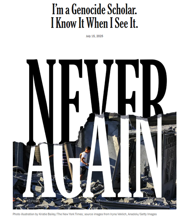 If anybody still gives a shit about the Palestinians, or the future of Israel for that matter, take 15 minutes to read this. I'm putting up a gift link, so it can be read in full and you can follow any of the links in this essay. Personally, I've been hesitant to use the word 'genocide' in preference of 'ethnic cleansing' to describe what's going on in Gaza. Still, this guy who studies this shit makes a compelling case and lays out a good global argument for why we shouldn't shy away from using the proper nomenclature. @statsman, who would be wise to read it, thinks he's supporting Israel in denying what's happening. On the contrary, his pigheadedness, as well as that of many others, only imperils the nation in the long term. By Omer Bartov Dr. Bartov is a professor of Holocaust and genocide studies at Brown University. A month after the Hamas attack on Israel on Oct. 7, 2023, I believed there was evidence that the Israeli military had committed war crimes and potentially crimes against humanity in its counterattack on Gaza. But contrary to the cries of Israelβs fiercest critics, the evidence did not seem to me to rise to the crime of genocide. By May 2024, the Israel Defense Forces had ordered about one million Palestinians sheltering in Rafah β the southernmost and last remaining relatively undamaged city of the Gaza Strip β to move to the beach area of the Mawasi, where there was little to no shelter. The army then proceeded to destroy much of Rafah, a feat mostly accomplished by August. At that point it appeared no longer possible to deny that the pattern of I.D.F. operations was consistent with the statements denoting genocidal intent made by Israeli leaders in the days after the Hamas attack. Prime Minister Benjamin Netanyahu had promised that the enemy would pay a βhuge priceβ for the attack and that the I.D.F. would turn parts of Gaza, where Hamas was operating, βinto rubble,β and he called on βthe residents of Gazaβ to βleave now because we will operate forcefully everywhere.β Mr. Netanyahu had urged his citizens to remember βwhat Amalek did to you,β a quote many interpreted as a reference to the demand in a biblical passage calling for the Israelites to βkill alike men and women, infants and sucklingsβ of their ancient enemy. Government and military officials said they were fighting βhuman animalsβ and, later, called for βtotal annihilation.β Nissim Vaturi, the deputy speaker of Parliament, said on X that Israelβs task must be βerasing the Gaza Strip from the face of the earth.β Israelβs actions could be understood only as the implementation of the expressed intent to make the Gaza Strip uninhabitable for its Palestinian population. I believe the goal was β and remains today β to force the population to leave the Strip altogether or, considering that it has nowhere to go, to debilitate the enclave through bombings and severe deprivation of food, clean water, sanitation and medical aid to such an extent that it is impossible for Palestinians in Gaza to maintain or reconstitute their existence as a group. My inescapable conclusion has become that Israel is committing genocide against the Palestinian people. Having grown up in a Zionist home, lived the first half of my life in Israel, served in the I.D.F. as a soldier and officer and spent most of my career researching and writing on war crimes and the Holocaust, this was a painful conclusion to reach, and one that I resisted as long as I could. But I have been teaching classes on genocide for a quarter of a century. I can recognize one when I see one. This is not just my conclusion. A growing number of experts in genocide studies and international law have concluded that Israelβs actions in Gaza can only be defined as genocide. So has Francesca Albanese, the U.N. special rapporteur for the West Bank and Gaza, and Amnesty International. South Africa has brought a genocide case against Israel at the International Court of Justice. The continued denial of this designation by states, international organizations and legal and scholarly experts will cause unmitigated damage not just to the people of Gaza and Israel but also to the system of international law established in the wake of the horrors of the Holocaust, designed to prevent such atrocities from happening ever again. It is a threat to the very foundations of the moral order on which we all depend. Continued: https://www.nytimes.com/2025/07/15/opinion/israel-gaza-holocaust-genocide-palestinians.html?unlocked_article_code=1.XU8.udoX.V-TuaxjE1gWW&smid=url-share