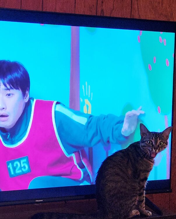 Gidget likes it up there, too. Here she is a few minutes ago, getting freaked out by Season 3 of Squid Games.