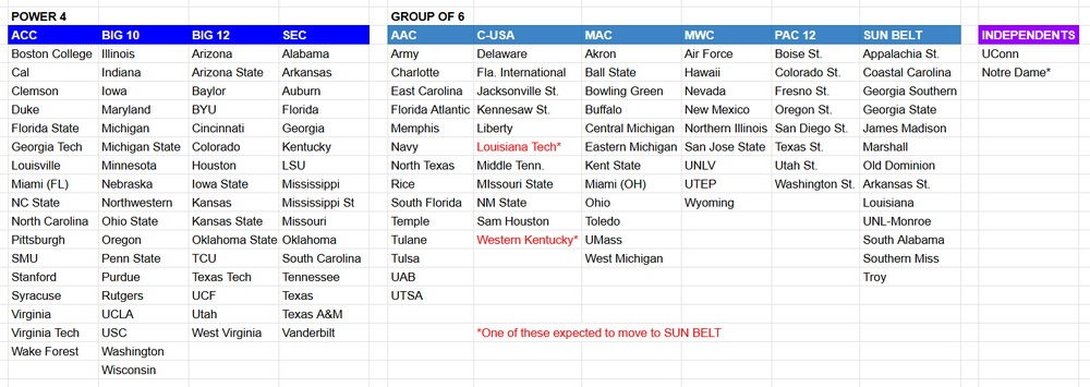 From the best I can tell, this will be the conference realignment for FBS teams in 2026. Please let me know if there's anything incorrect.