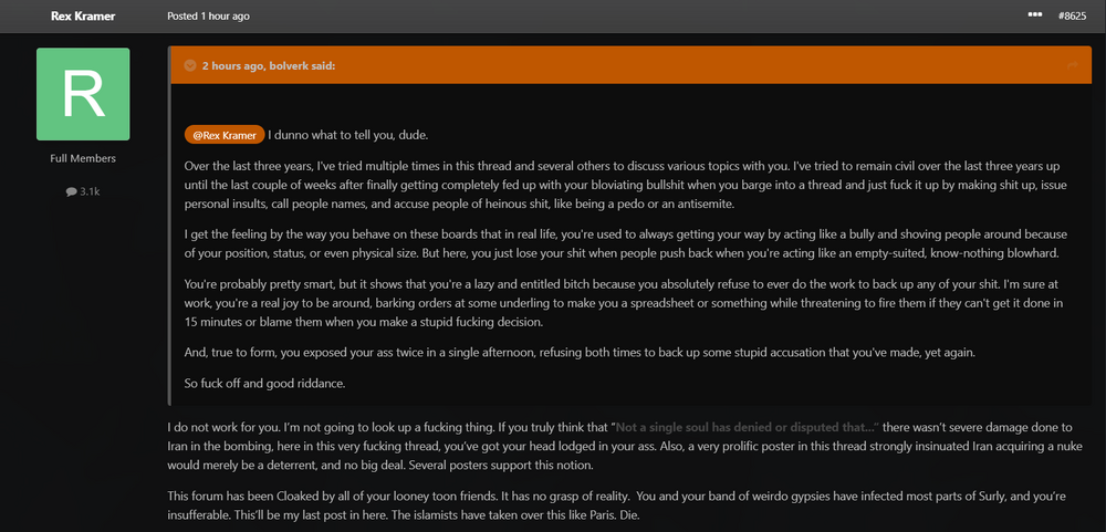 After seeing your reply to him, and against my better judgment, I thought about it and decided to view his response just in case his order to "die" was directed at me, and I see that it was. Interesting. I went ahead and took a screenshot of that command from Rex to "die" on the off-chance y'all find that I've suddenly stopped posting one day. As we've recently seen, bigots are really feeling their oats these days and are all in on the old ultraviolence. So, I've got a simple request for someone to download it on their hard drive for me. Please and thanks in advance. But, then again, we're also seeing that hateful racists, such as "War Crimes Rex," do have the backing of what passes for law enforcement. Eh, whatchagunnado.