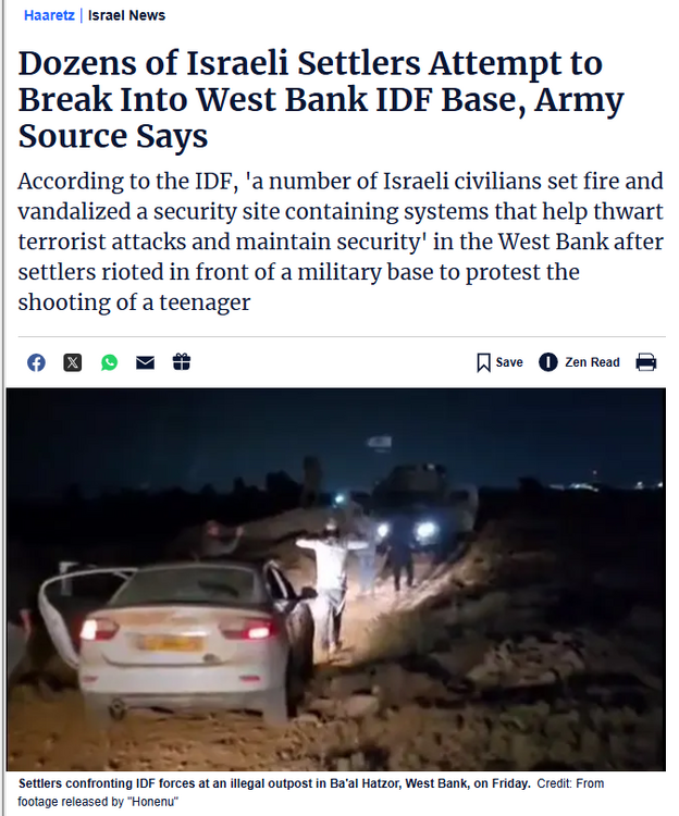 Some bizarro world shit going on in the West Bank with Settlers attacking an IDF base because a Jewish teen was shot with a rubber bullet. The officer who shot the kid thought he was a Palestinian, but he was a part of a Settler group that was attacking the officer with rocks. Itβs believed members of this same group may have also been some of the same ones who rampaged through a Palestinian camp last week, in which the IDF somehow ended up killing three Palestinians. At least, I think thatβs what was going on, but Iβm going to need a diagram, flowchart, or something to be sure. The story is kind of hard to follow, but it's clear the Settlers are out of control, and it's incredible how much they get away with. Free link: https://archive.is/LyjgL