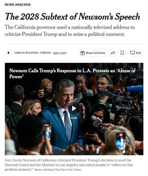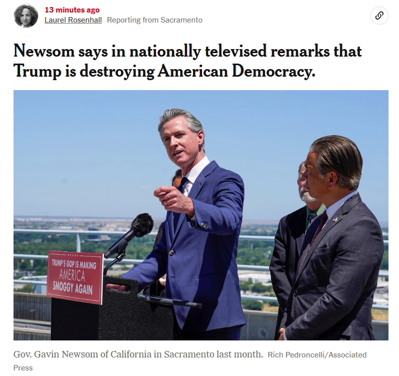 @hobbes2702 and others who don't feel like watching Newsom's address. Quick NYTimes write-up below. I'm sure there will be more written later in other media. This feels like a showdown. https://www.nytimes.com/2025/06/10/us/newsom-speech-trump-la-protests.html?smid=url-share Gov. Gavin Newsom made the case in a televised address Tuesday evening that President Trump’s decisions to send military forces to immigration protests in Los Angeles have put the nation at the precipice of authoritarianism. The California governor urged Americans to stand up to Mr. Trump, calling it a “perilous moment” for democracy and the country’s long-held legal norms. “California may be first, but it clearly won’t end here,” Mr. Newsom said, speaking to cameras from a studio in Los Angeles. “Other states are next. Democracy is next.” “Democracy is under assault right before our eyes — the moment we’ve feared has arrived,” he added. Mr. Newsom spoke on the fifth day of protests in Los Angeles against federal immigration raids that have sent fear and anger through many communities in Southern California. He said Mr. Trump had “inflamed a combustible situation” by taking over California’s National Guard, and by calling up 4,000 troops and 700 Marines. The governor is considered a possible Democratic presidential candidate in 2028, and his Tuesday night speech, called “Democracy at a Crossroads,” sounded national in scope. It aired on some national networks and on Mr. Newsom’s social media accounts. The current political standoff has made it possible for Mr. Newsom to have a wider platform, and he has jousted with President Trump and Republicans for several days in interviews and on social media. “Authoritarian regimes begin by targeting people who are least able to defend themselves.,” Mr. Newsom said in his speech. “But they do not stop there. Trump and his loyalists thrive on division because it allows them to take more power and exert even more control.” The address was an unusual move for Mr. Newsom, who has dyslexia and dislikes reading from a teleprompter to deliver formal speeches. But he has been using every communication channel possible to raise alarms about the extraordinary measures Mr. Trump has taken to mobilize the military for domestic uses. Not since the civil rights movement in the 1960s has a president sent National Guard troops to quell unrest without the support of the state’s governor. “I ask everyone to take the time to reflect on this perilous moment,” he said, “a president who wants to be bound by no law or constitution, perpetrating a unified assault on American traditions.”