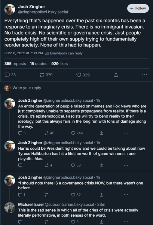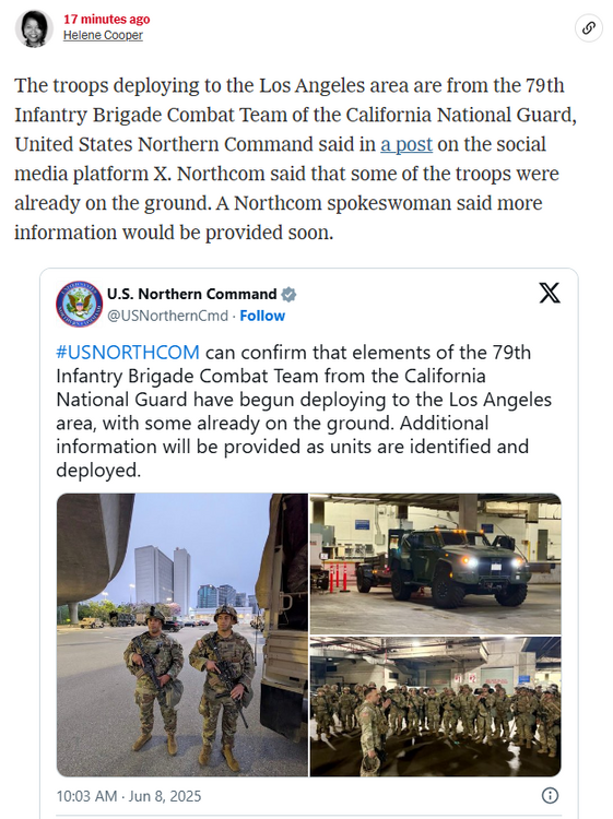 So, last night, I stayed up watching the ABC affiliate in Los Angeles, covering the protests. According the anchors, the thousands of legit protesters had gone home, but a 100 or so shitheads decided to stick around and cause trouble. How the fuck are "the Democrats" responsible for or behold to thuggish dickheads? "The Democrats" aren't leading or organizing these spontaneous protests. "The Democrats" obciousky disagree with the regime's gestapo tactics, but they aren't doing shit. Why aren't you laying blame at the Trump regime for provoking all this?