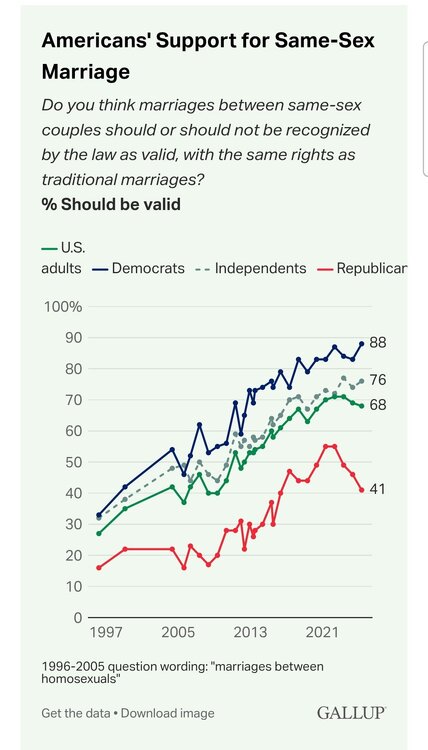 This is definitely a 'them' not 'us' issue. Look at what's happened to Republican support in the last three years. Click Gallup article heading for more. Record Party Divide 10 Years After Same-Sex Marriage Ruling Republican support has dropped 14 points since 2022 WASHINGTON, D.C. β A decade after the Supreme Courtβs milestone Obergefell v. Hodges ruling declared same-sex marriage a national right in the U.S., a steady 68% of Americans support it. Since 2021, the percentage of U.S. adults who think marriages between same-sex couples should be recognized with the same rights as traditional marriages has ranged from 68% to 71% (the trend high in 2022 and 2023). Yet, this stability in Americansβ backing for same-sex marriage masks shifts in partisansβ views over the same period. Democratsβ support has risen to 88%, the record high for this group by one percentage point. Independentsβ backing for same-sex marriage has been relatively stable in recent years and currently stands at 76%, one point shy of the record high. At the same time, Republicansβ support, which peaked at 55% in 2021 and 2022, has gradually edged down to 41%, the lowest point since 2016 after the Obergefell decision. The current 47-point gap between Republicans and Democrats is the largest since Gallup first began tracking this measure 29 years ago.