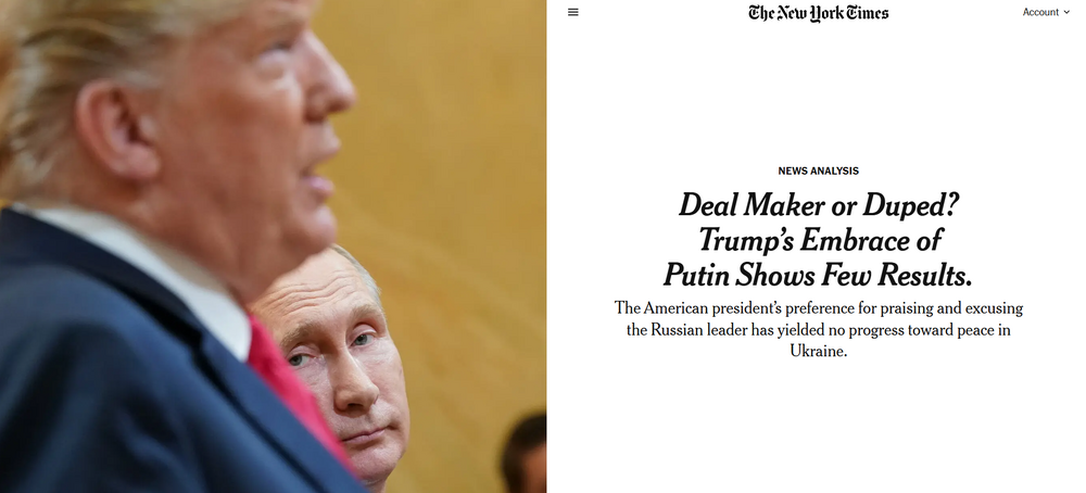 Russian asset and dumbest American president in history is maybe, perhaps, starting to figure shit out after at least 10 years that heβs being played like the stupid, fat fiddle he is. Photo below cracks me up. https://www.nytimes.com/2025/05/29/us/politics/trump-putin.html