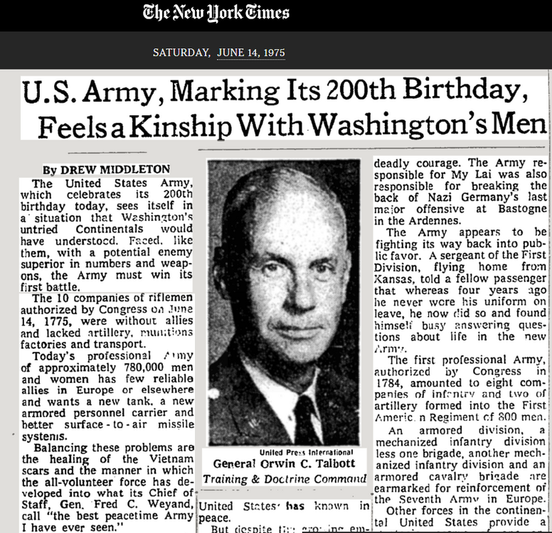Went to the TimesMachine to see what they had on the 200th anniversary. No mention of a parade, but it's a pretty interesting read. https://www.nytimes.com/1975/06/14/archives/us-army-marking-its-200th-birthday-feels-a-kinship-with-washingtons.html https://archive.is/lXDDP About the Archive This is a digitized version of an article from The Times’s print archive, before the start of online publication in 1996. To preserve these articles as they originally appeared, The Times does not alter, edit or update them. Occasionally the digitization process introduces transcription errors or other problems; we are continuing to work to improve these archived versions.