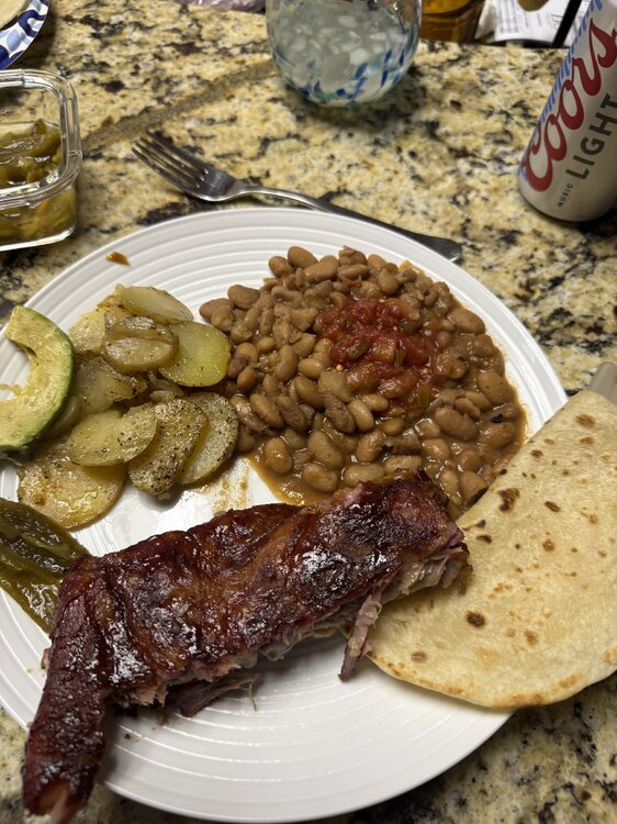 Slice of avocado, some sliced pickled jalepenos, potatoes (not pickles)cooked in butter in a foil pouch, not canned pinto beans with a dallop of La Costa Salsa Casera—but close enough I had planned to make potato salad but I got too drunk so i sliced the potatoes and scooped on some butter, ample salt and a lot of pepper and into a tinfoil pouch onto the smoker with the ribs for the last hour. Technique of some old piasanos from back home on the border. Easy and fantastic. Bad lighting made them look pickley