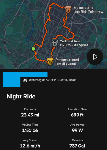 4. I try to get 50mi a week, which makes 2500/yr. I'm well under that goal this year - strava says 61 rides for just over 1300mi, so maybe at 1400 max. The reality is that unless you're really jamming out, cycling isn't awesome for losing weight. Great for keeping moving and being active, and damn sure better than sitting on your ass, but your heart rate just isn't getting into that max window enough to burn a bunch of calories. Spin class does a much better job imo, but I'd much rather be outside in the elements. I will say that not riding to bars/breweries will help you drop weight! Last night's ride: