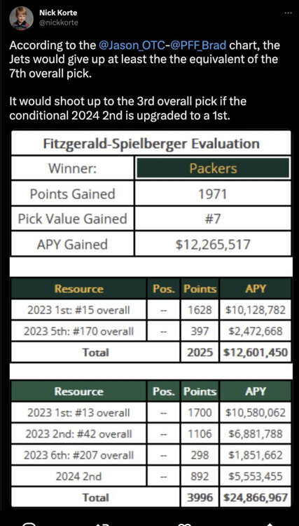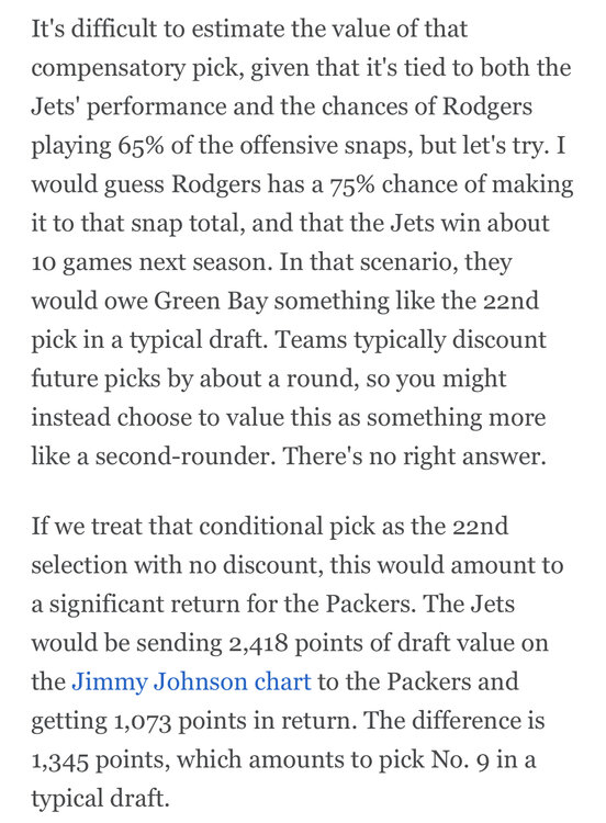 9. Not my calculations, guys who cover the sport. There’s a million different trade value charts out there and the conditional pick makes it difficult to value exactly, but most have concluded the total package is worth a top 10 pick, including Bill Barnwell’s article below. And if the Jets make the playoffs it means Rodgers played 65%+ and the Packers get a first, so them doing well doesn’t really hurt Green Bay. Obviously the ideal outcome for the Packers would be Rodgers playing and the Jets only winning 8 or 9 games so the Packers get a mid-first.