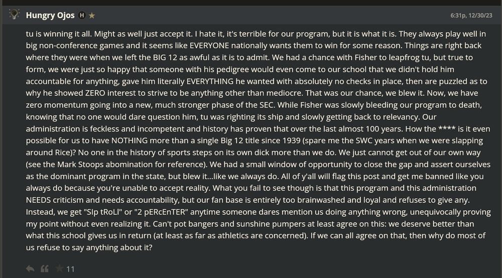 11. What?!!! NYT indulging in sketchy journalism by taking random data points to spin a narrative? I would have never guessed! Look how the smug reporter implies that Texas recruited OL Class only because of $50K per year. Flood handled it well, imo.