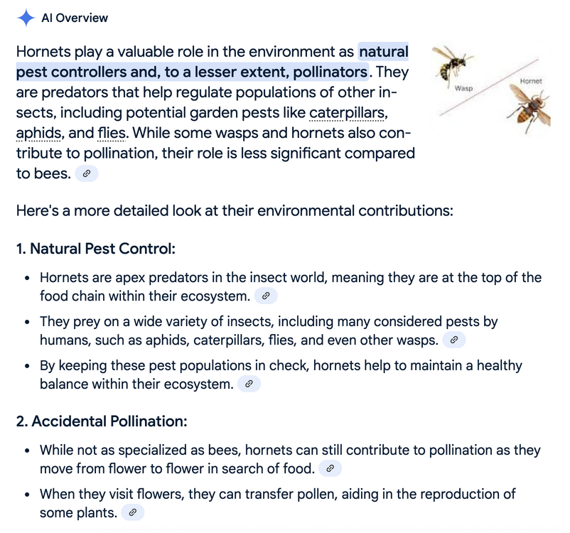 18. I was curious about the benefit of keeping hornets around and why you wouldn't just take a flamethrower to the whole area and incinerate every last one of those motherfuckers. but AI told me they play a key role in keeping other pests in check. the more you know.