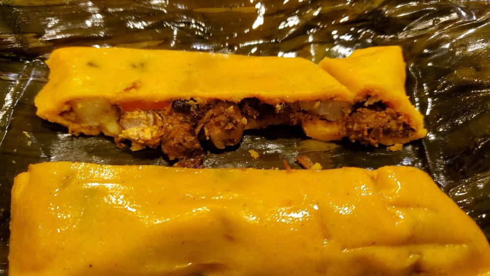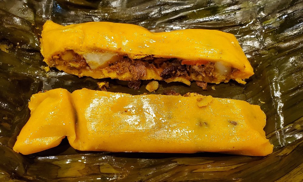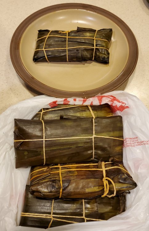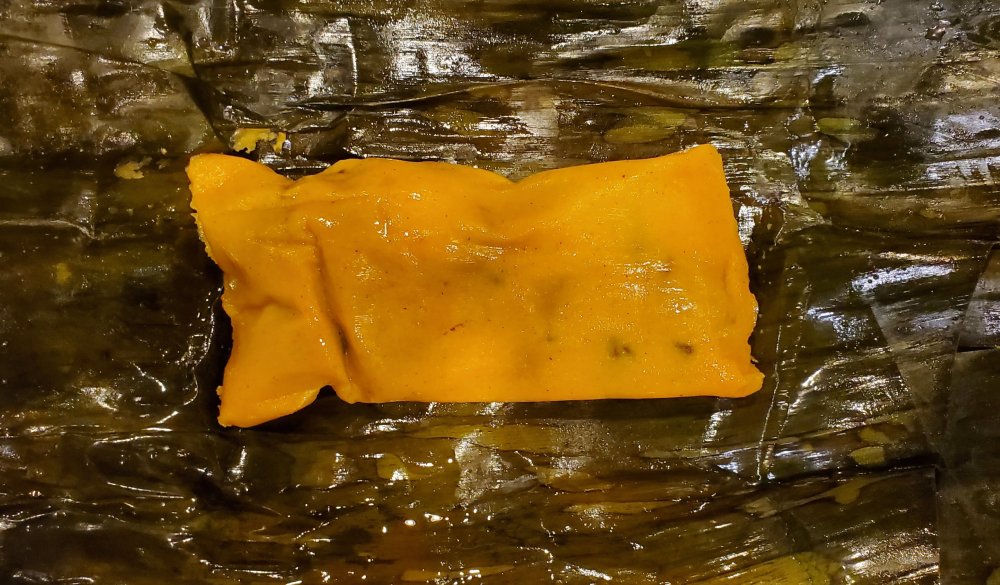16. These are hallaca (pronounced ah-yawk-uh) -- a traditional Venezuelan Christmas dish. They are made in a similar fashion to tamales, but don't taste anything like them. They are made by stuffing arena de pan spread on plaintain leaves with a mix of beef, pork, potatoes, carrots, green and red peppers, sweet peppers, onions, garlic, leeks, green onions, raisins, capers, green olives, aceite de achiote, and spices. The stuffing is cooked separately, then allowed to cool before putting it on the arena de pan which has been spread on the plaintain leaves, all of which is then wrapped and tied off to be boiled.