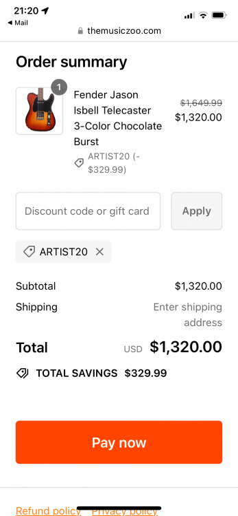 19. The Isbell Tele is 20% off at Music Zoo. Actually, all the artist guitars are 20% off. Code: Artist20.