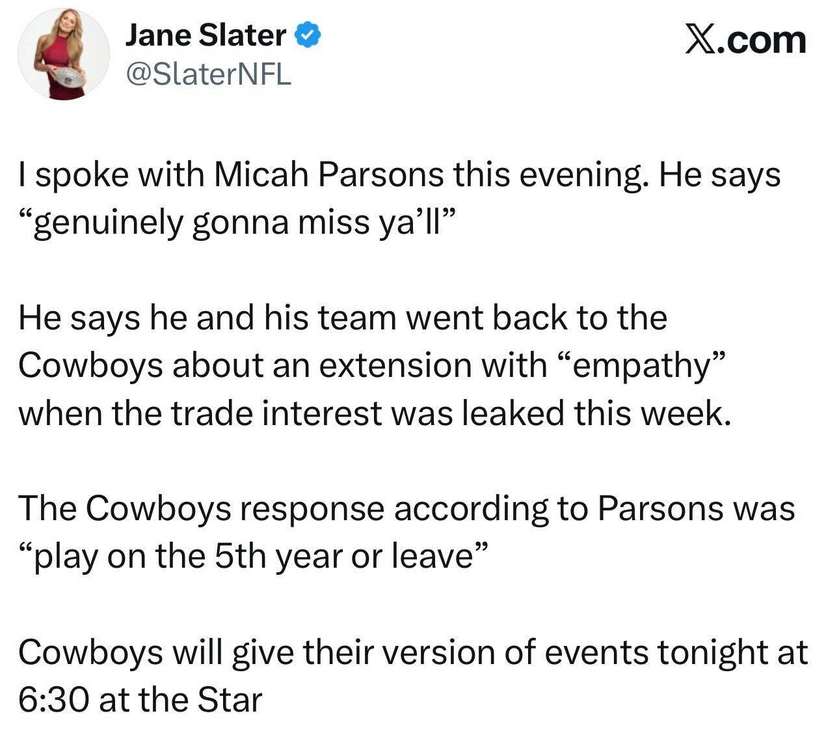 7. Heard Dan Patrick and Colin's take. Colin liked the trade. Said they know they're not gonna win even with Micah. Next year's draft is stronger. JMO. Jerry wants one last run with a big name QB. He's going to move Dak and their #1 (likely top 7) to get into the Allar/Arch sweepstakes