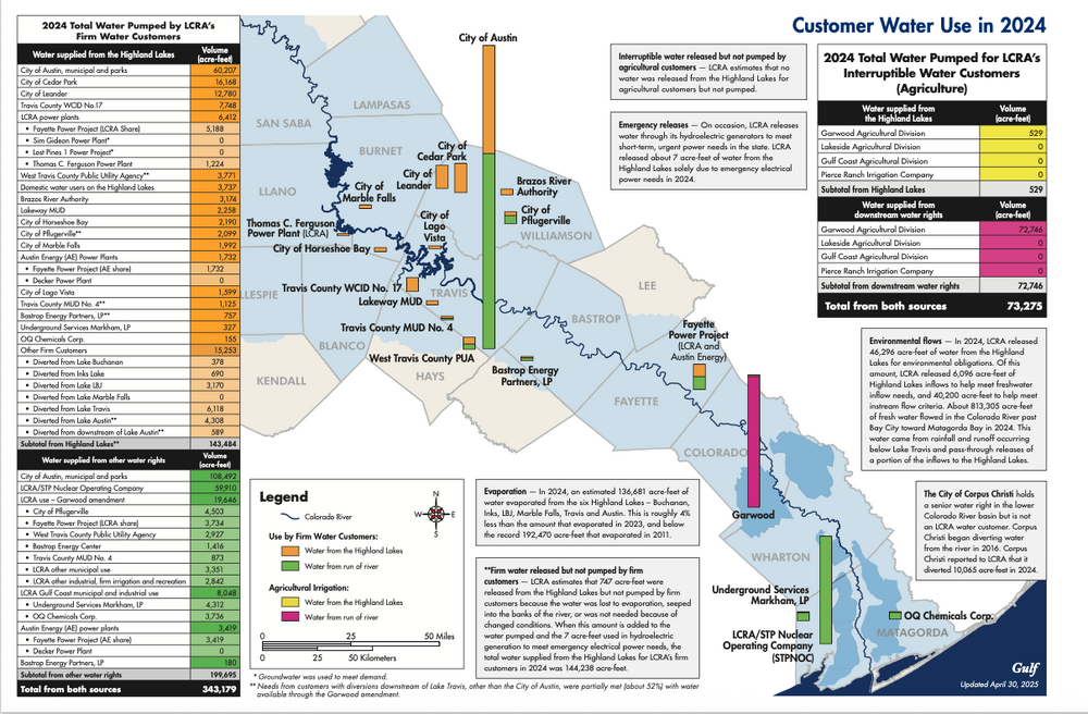 In this article from 2024, an LCRA spokesman claims that wind and evaporation is roughly equal to the consumption in the city of Austin. 1" every 5-6 days. That was when the lake was at around 42%, which would mean a surface area of around 10k acres. So, 10k acre-inches per 5 days -> 833 acre-feet per 5 days -> 5000 acre-feet per month or 60k acre-feet per year. This is around 1629 million gallons per month lost by evaporation and the same consumed by the city of Austin. This LCRA link shows that Austin uses 140k acre-feet, so perhaps the 1" number at 10k acres (from the original article) is inaccurate. This PDF Link (cut-paste below) shows that City of Austin pulls 60k acre-feet per year from the highland lakes (confirms the original link) and another 100k acre-feet are pulled from Lake Austin and other rivers. Cedar Park, Leander, and TC WCD are pulling about 37k acre-feet from the highland lakes. Thanks for asking, as I would not have gone down this temporary rabbit hole