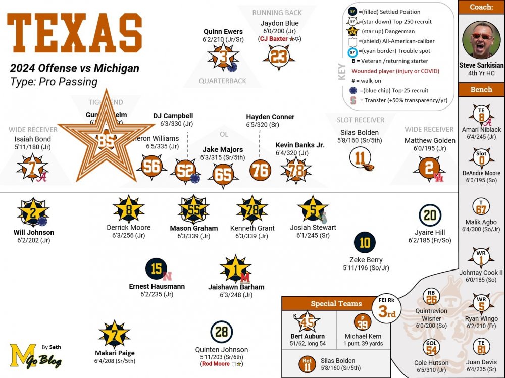 I have to disagree with some of this. It's a misperception that turnovers are always unforced errors. Alabama turned the ball over in that game because Texas' D-line was beating their ass all night. When Milroe threw it right at Barron, that wasn't an unforced mistake. Barron baited Milroe into that throw; that's what Jahdae Barron does. Sure, any game can go differently if a few key plays break the other way, but there was as much shooting of itself in the foot by Texas in that game as by Alabama (e.g. Xavier Worthy dropped TD, Bert Auburn missed FG). Early in the fourth quarter, Texas trailed 16-13 after mostly controlling the game. On the two Alabama could-be-touchdowns that were called back, one was a blatant hold by the Tide which prevented a Texas sack of Milroe. The other was a near-interception by Jaylan Ford that bounced right off his hands. I'm not a fan of the woulda coulda shoulda game, but if we're going to play that game, those weren't two should-be touchdowns for Alabama; it was a should-be sack and a coulda-been interception for Texas. Texas could've won by more than it did. The narrative coming out of that game was, yes, great game by Texas, but this isn't the same Alabama team as in the past. Alabama fans almost universally believed that Texas won because Milroe is trash when in fact it was clear watching that game that Milroe made a lot of great plays and that his playmaking was the only thing keeping Alabama in it. Almost no one was predicting that Alabama would run the table or reach the playoff. This was a flawed team that had at least another loss or two on the schedule. We saw how it turned out. 2024 Michigan won't be as good as 2023 Alabama. I'm still not buying that they are absolute trash and will lose 5 or 6 games. That's just the narrative that emerges when Texas goes in and beats the doors off a national power early in the season. In a contrarian take, I also don't expect Warren to be as bad as most people are saying. While inconsistent, he flashed with quite a few really good throws. The 4th and 4 throw for 15 yards with a blitzer right in his face was absurd. Like Sark said, Texas is good. This is who we are. The rest of the country needs to get used to it.