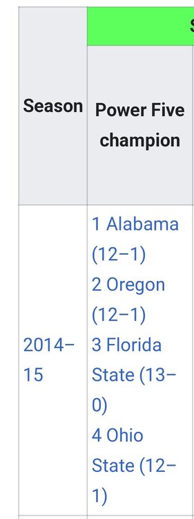 8. In 2014 the committed did all they could to keep a 13-0 FSU team out and only relented because they were the defending Champs and lack of alternative. They ended up getting the 3rd spot behind two 1 loss conferences Champs. They'll leave an even worse FSU team to get us and Bama in.