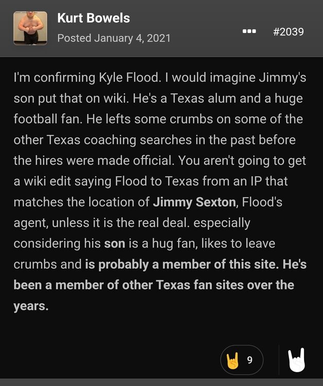 13. The Sexton angle here is very interesting. During the Sark assistant hirings there were murmurs here that his son was updating wikipedia when hires were getting finalized behind the scenes. Somebody smarter than me can check the IP address location of the recent wiki changes saying Vitello was the new Texas head coach. Screenshots of the Sark hires and discussion from 2021
