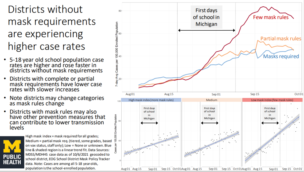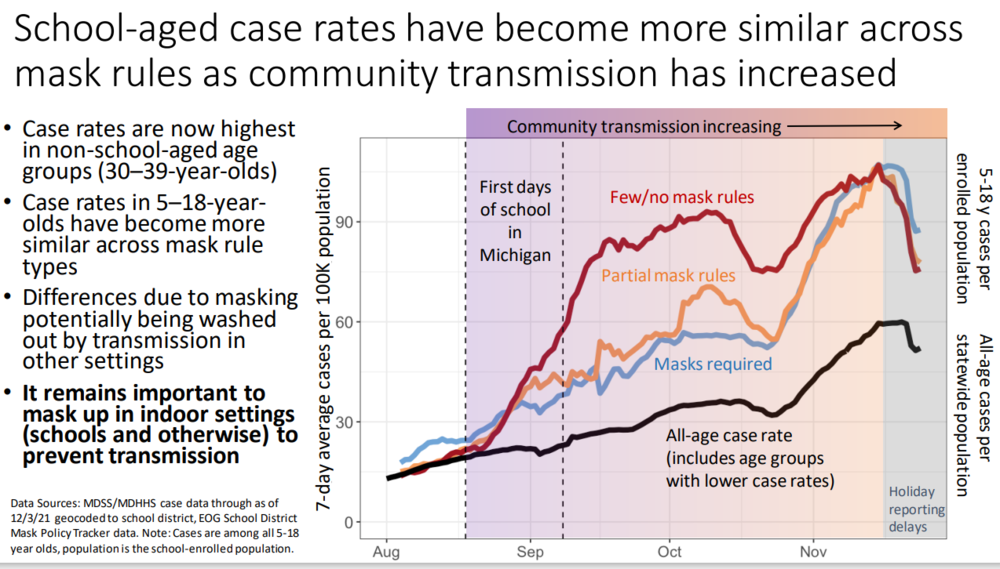 What I'm still unclear on is their methodology. Based on the footnote in the lower left, it seems as though they're counting cases from the 5-18 age group and then applying it to the public school area that those cases are originating in. So, in ATX terms, if a 10 year old in zip code 78758 gets sick, they'd see that as a case for a school with "masks required" even if that kid went to private school with a lax mask policy or was home schooled.