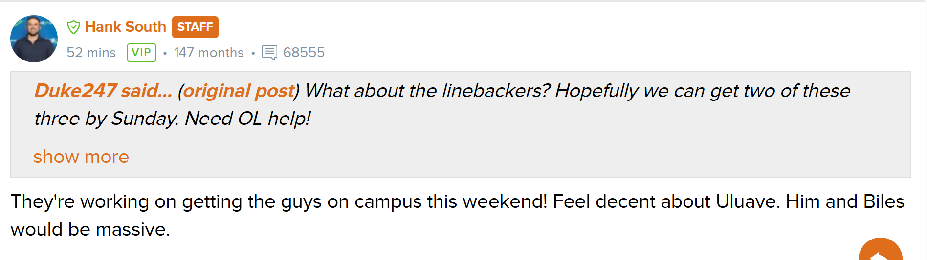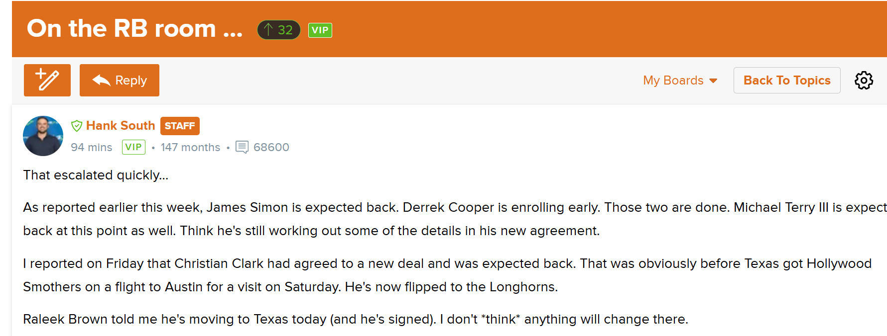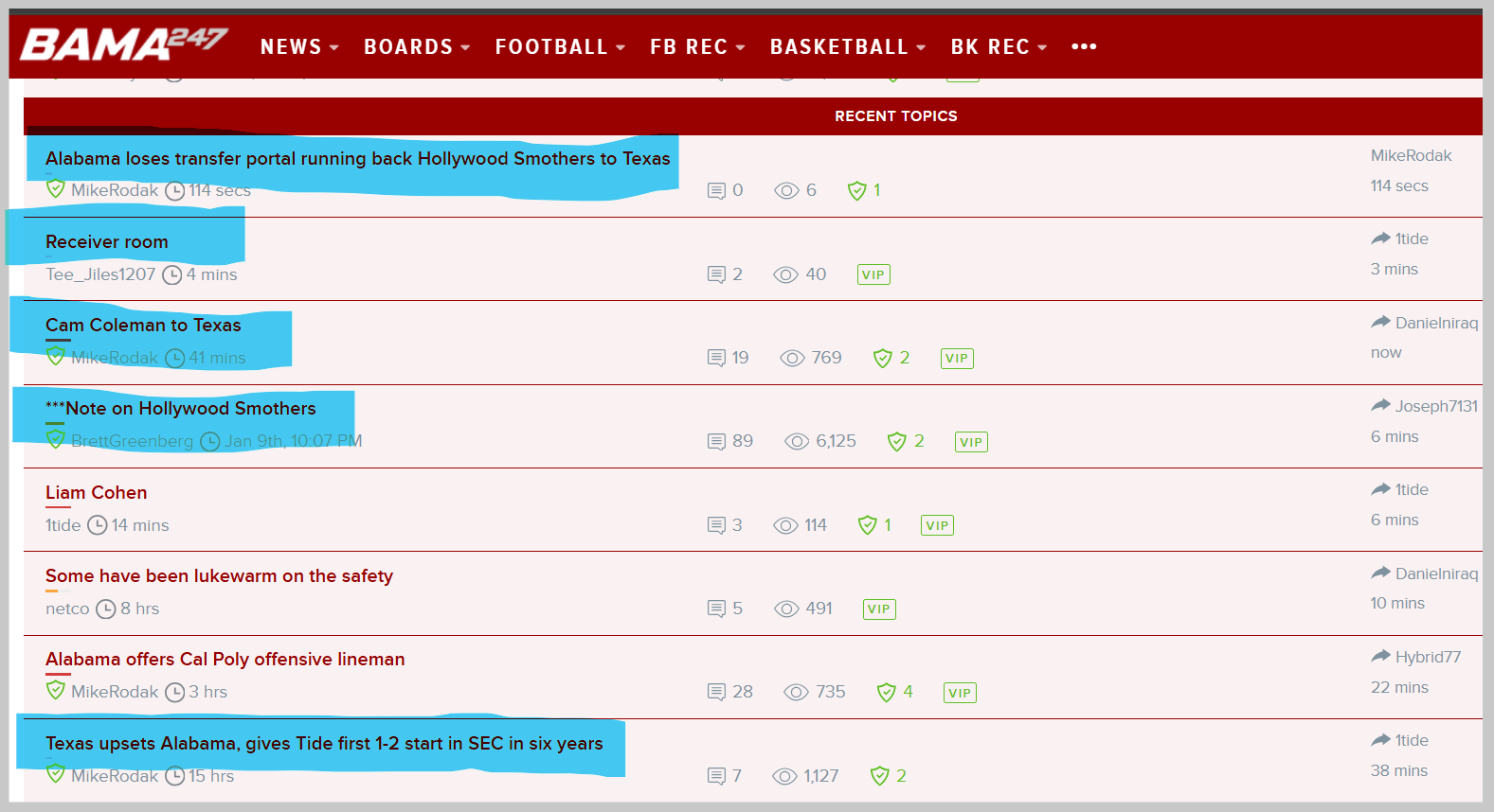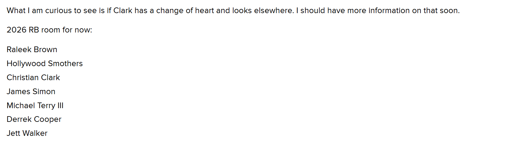 Update from Bama 247 - Coleman, Smothers, a new WR and new RB, and a few others. ********************************************************************************************************************************** Sunday Scoop: Breaking down the latest Alabama transfer portal buzz Brett Greenberg (Bama 247) Sunday Scoop: Breaking down the latest Alabama transfer portal buzz Sunday Scoop: Breaking down the latest Alabama transfer portal buzz Brett Greenberg (Bama 247) The official NCAA Transfer Portal window opened on Jan. 2 and runs through Jan. 16. Alabama has brought in eight new additions for the 2026 roster and the work is not close to done for head coach Kalen DeBoer, general manager Courtney Morgan and the rest of the staff. Oklahoma State tight end Josh Ford, NC State running back Hollywood Smothers, Virginia Tech linebacker Caleb Woodson, Michigan interior offensive lineman Kaden Strayhorn, USC defensive lineman Devan Thompkins, Mercer defensive back Carmelo O'Neal, North Alabama punter Adam Watford and Syracuse long snapper Ethan Stangle make up the current group of incoming transfers for the Crimson Tide. ALABAMA TRANSFER PORTAL TRACKER: Latest updates on who's coming and going ALABAMA 2026 ROSTER TRACKER: Who's coming? Who's going? Who's staying? Who are the other names to know? Which prospects have already taken visits, who we are tracking closely? Who is still on campus? Bama247 breaks down all of the latest buzz heading into Sunday afternoon/early next week! MULTIPLE WIDE RECEIVERS ON CAMPUS OVER THE WEEKEND! - The big one is No. 1 portal pass-catcher Cam Coleman, who spent two seasons with Auburn coming out of Phenix-City Central (Ala.) High School. Coleman arrived on campus on Friday for his trip and left campus later Saturday night, which Bama247 noted then. The 6-foot-3, 201-pounder and former five-star in the 2024 class also took trips to Texas, Texas A&M and Texas Tech over the last week or so. Bama247 was told the trip to Tuscaloosa (Ala.) over the last two days went very well and, to no surprise, new receivers coach Derrick Nix is leading the way here. The former Auburn offensive coordinator during the 2025-26 season is playing a strong role in the Coleman sweepstakes and it wouldn't be shocking if a final decision was made very soon. Bama247 is continuing to work the phones, but one thing that is certain? Alabama is squarely in the mix for one of the most electrifying prospects in the country. - Bama247 shared another note late Saturday night after learning that former NC State receiver Noah Rogers made it to campus for his visit earlier this afternoon and is expected to wrap up the trip in Tuscaloosa (Ala.) at some point on Sunday. The Rolesville (NC) native tallied 35 receptions for 478 yards and a touchdown in his freshman season in 2024. He hauled in 33 receptions for 441 yards and two touchdowns in his second year with the Wolfpack during the 2025 season. Bama247 is hearing some positive things when it comes to Rogers' experience on campus so far and will continue to track very closely heading into Sunday afternoon/early next week. THE LATEST WITH A RECENT PORTAL ADDITION... - As reported on Friday night and confirmed early Saturday morning, former NC State running back Hollywood Smothers is at Texas for a visit after publicly committing to the Crimson Tide earlier this week. Bama247 is continuing to work the phones when it comes to the 5-foot-11, 195-pounder and ACC leading rusher (85.4 yards per game). As far as the enrollment status with the University of Alabama goes, it has been confirmed that is the case. If this doesn't show just how wild the transfer portal is, I am not sure what will. Stay locked into Bama247 for continued updates. ANOTHER RUNNING BACK WORTH KNOWING! - Bama247 learned of another name to know when it comes to the running back position early Sunday morning with Makhi Frazier. The 5-foot-10, 218-pounder led Michigan State in carries (116) and rushing yards (520) across nine games (7 starts) in 2025. He missed three of the final four games due to an injury. A visit to Tuscaloosa (Ala.) feels like a possibility, but Bama247 is still digging for more when it comes to Frazier. Ohio State hosted the running back over the weekend. SOME OFFENSIVE LINEMEN TO TRACK... - Former LSU offensive tackle DJ Chester wrapped up his Alabama visit over the weekend and Bama247 is hearing positive things coming out of the trip. The 6-foot-6, 315-pounder has also seen Georgia Tech, Baylor, South Carolina and Mississippi State before since entering his name in the transfer portal. Offensive line remains a massive need for the Crimson Tide and the former Eagle's Landing Christian Academy (Ga.) standout is absolutely a name to know. - Alabama extended an offer to Cal Poly offensive line Racin Delgatty late Saturday night. Several other programs have jumped in on the 6-foot-4, 310-pounder with two years of eligibility remaining including: Michigan, UCLA, Northwestern, Baylor, Colorado, Kansas, USF, Colorado State, Washington State, Oklahoma State, Boise State, San Diego State, Oregon State, Fresno State, UMass, Wake Forest, Hawaii and New Mexico State. Cal Poly was home to former Alabama tight end Josh Cuevas, who followed (Kalen) DeBoer over the Crimson Tide from Washington. A visit to Alabama has been lined up for Wednesday, Jan. 14, he shared later on Sunday morning. Bama247 will have more then. CIRCLING BACK!? - Michigan offensive tackle Ty Haywood: The former four-star recruit in the 2025 class, who was committed to Alabama for many months before flipping to the Wolverines last January, arrived on campus for a big visit on Saturday afternoon as reported by Bama247. The 6-foot-5, 315-pounder appeared in three games (15 snaps) with Michigan in the 2025 season (Central Michigan, Maryland, Texas). The love for Alabama was very strong during the recruitment process, hence the long commitment with the Crimson Tide and that has not faded based on what Bama247 is heari