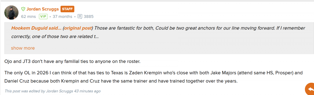 Several nice quotes in this article, from 'ol Chasedahbag. This one made me chuckle. "We talked about how the school is and how much he wants me there," Calicut said of his conversation with Joseph. "He said I fit in their scheme and that I fit in like Michael Taaffe. He said I play similar to Michael Taaffe. That felt good to hear too, because that's a good player. Who doesn't want to play like Michael Taaffe?" And this sounds good ... "Oh yeah Texas for sure," Calicut said of his current standouts. "Texas has been one of my dream schools since I was a little kid. Forever been a Longhorns fan. I played for a little league team called the Longhorns so Texas has been standing out. Of course Oregon stands out. Michigan, LSU, think those standout but I think Texas is leading the race for sure." Texas 'leading the race' for newly offered North Shore Top247 defensive back Chace Calicut Jordan Scruggs (Horns 247) -