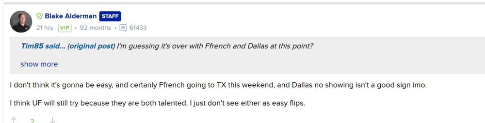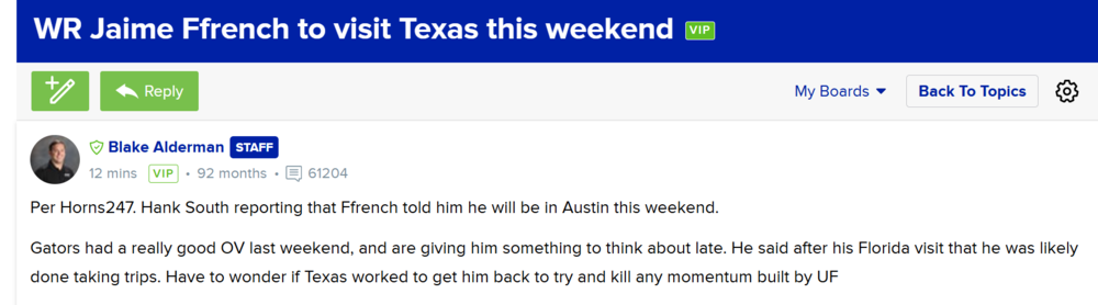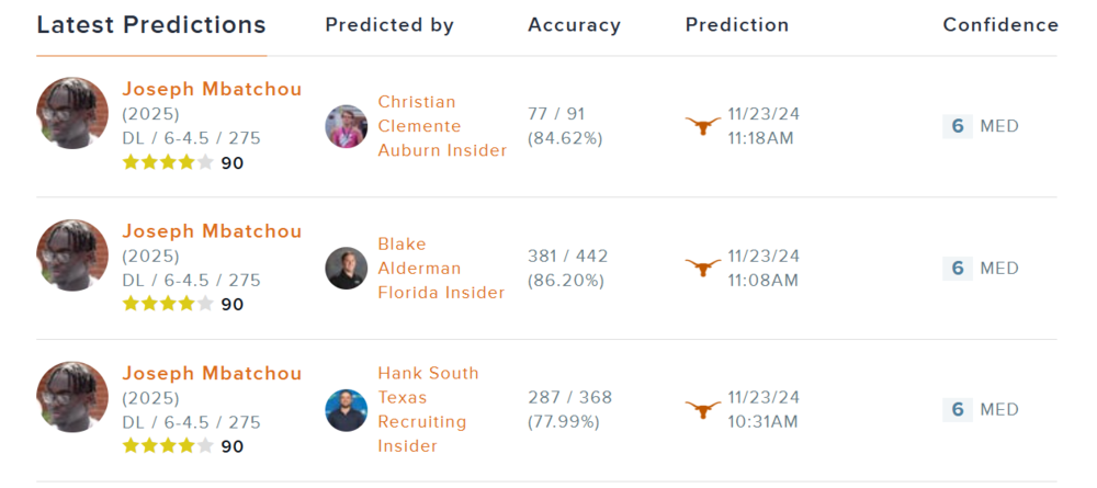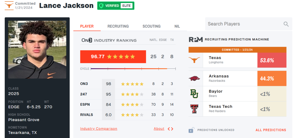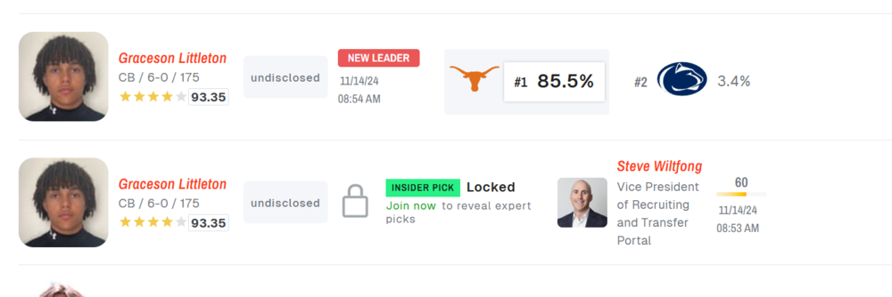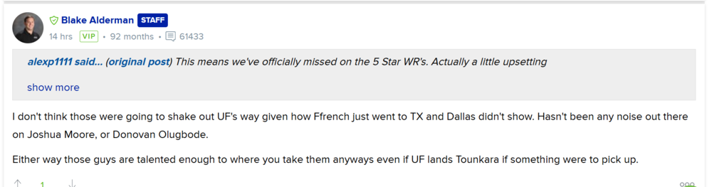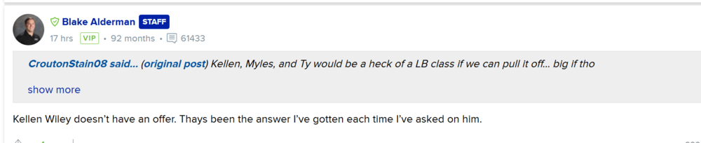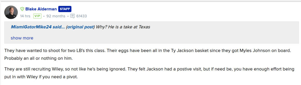2. So, couple of interesting points re: the Gators. - Florida's been considered the primary threat re: LB Kellen Wiley and Jaime Ffrench - the Gators just secured a flip/commitment from a highly rated LB who was previously committed to USC (Ty Jackson - # 124 composite overall), and they don't seem to have offered Kellen Wiley (yet, anyway) - they've gotten a slew of Crystal Balls for Muizz Tounkara, a big WR currently committed to Arizona Seem to augur well for Wiley and Ffrench. A couple of relevant posts from Blake Alderman (Gators 247) ON LB KELLEN WILEY ON WR JAIME FFRENCH (AND DALLAS WILSON) :-))