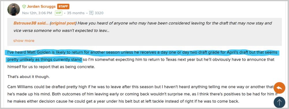 13. Jordan Scruggs (Horns 247), on Matthew Golden (and Cam Williams), a week ago.