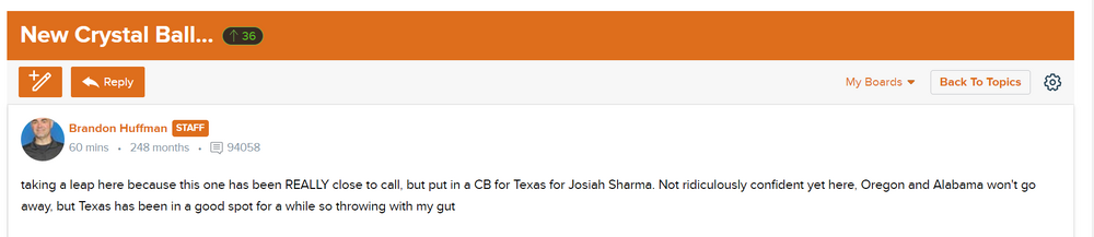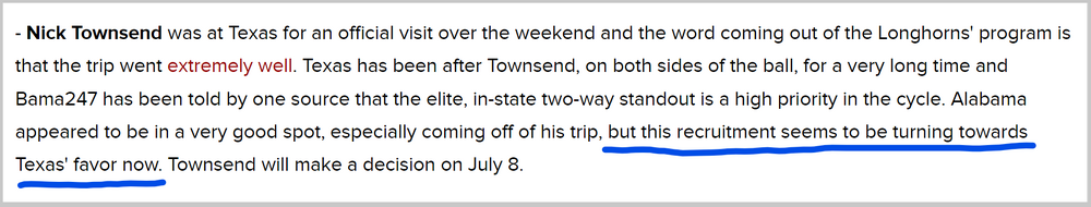 Hank South (Horns 247) (After the Brew-haha.) **************************************** Just need to take a breath. There are no locks in recruiting. I will say we still feel good about Townsend and Dakorien Moore. And if the last 48 hours are of any indication you can bet Texas is circling back on it's other top guys to close. Pettijohn would be a miss. If you can get Madden Faraimo, then I'm not sure you're hurting there at all. Plus Jon Cunningham. I'm not trying to make excuses. But I've seen this so many times in almost a decade of recruiting reporting to believe that Texas is going to be just fine. ********************************** -