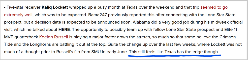 ON SMITH-OROGBO, FROM OU 247 AND HORNS 247 THE GIST Sooner 247 “Could I see a world where Oklahoma is the choice? Sure. But right now I'd be slightly leaning towards Texas.” “The latest intel I've been able to gather, while certainly indicating Oklahoma remains towards the top, would have me at least thinking that Texas could be the pick.” Horns 247 “Texas as definitely kept it interesting and rebounded from the early month momentum Tech had. Jordan is going to cover it in-depth in The Stampede. We feel it's Texas vs. OU.” FULL OU 247 ARTICLE Collin's Corner: Where I'm at on Smith Orogbo (6/30) Collin Kennedy (OU 247) -